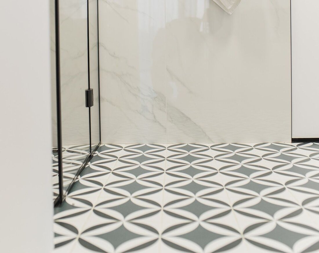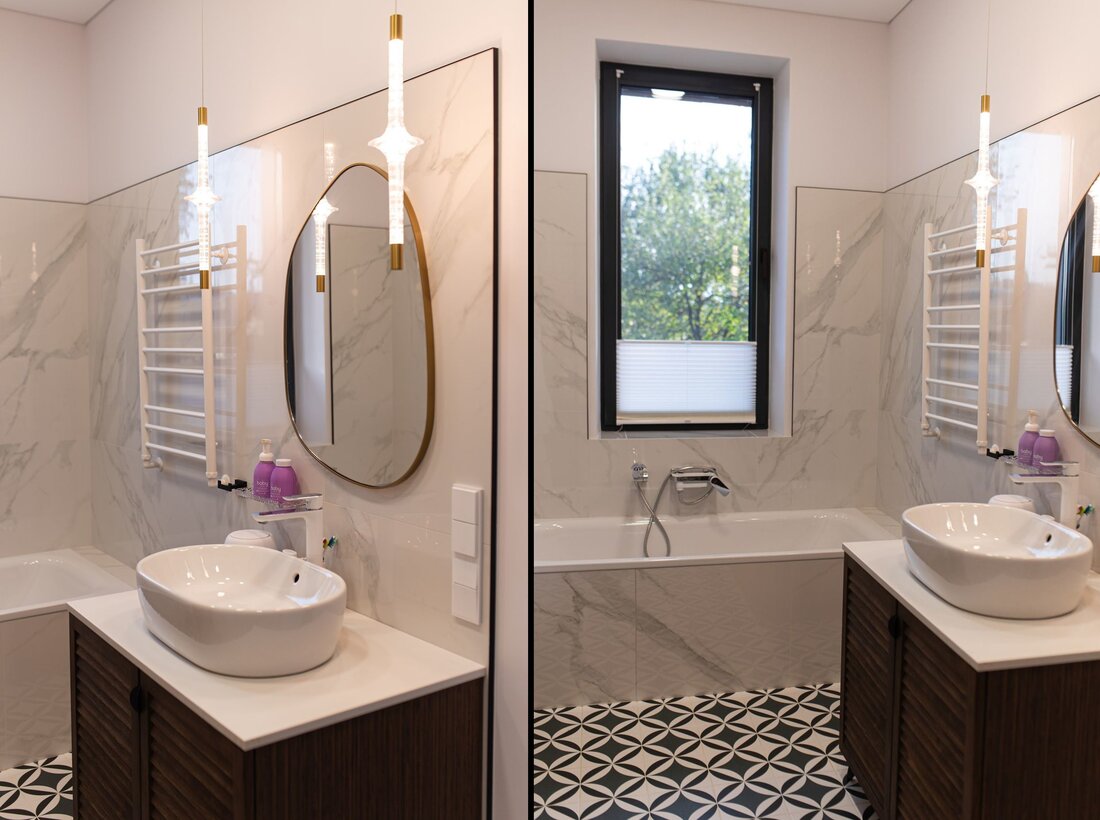 На полу в ванной, санузле и тамбуре уложена польская плитка Paradyz из коллекции Motyv (эти зоны — с подогревом). Орнаментальный характер плитки придает дому ту самую душевность и атмосферу. Это не прямое применение белорусского орнамента, а намек на то, что когда-то было близким. Рядом с ней иранский керамогранит — крупноформатный и ультрасовременный. И на стыке лаконичного и декоративного возникает гармоничный образ.