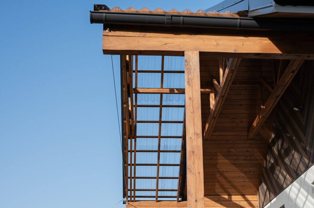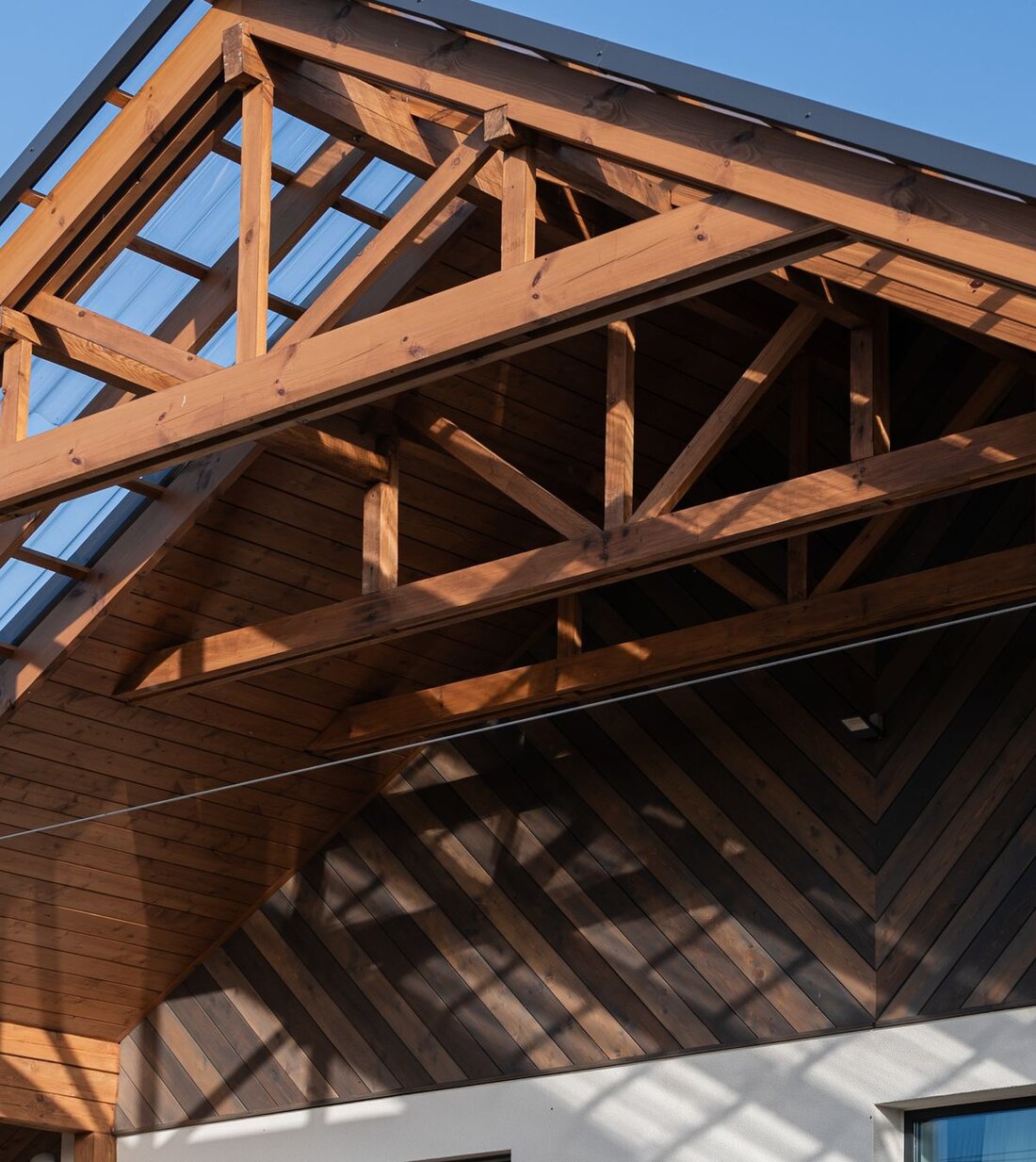 Изюминка от конструктура — сложная стропильная система крыши над террасой. Она рассчитана таким образом, чтобы можно было убрать подпирающие центральные колонны. Благодаря этому через панорамные окна открывался вид на поле без визуальных помех. Закат и поле становятся частью интерьера. И само решение — изящное, ажурное, — продумано так, чтобы остаться видимым в интерьере.