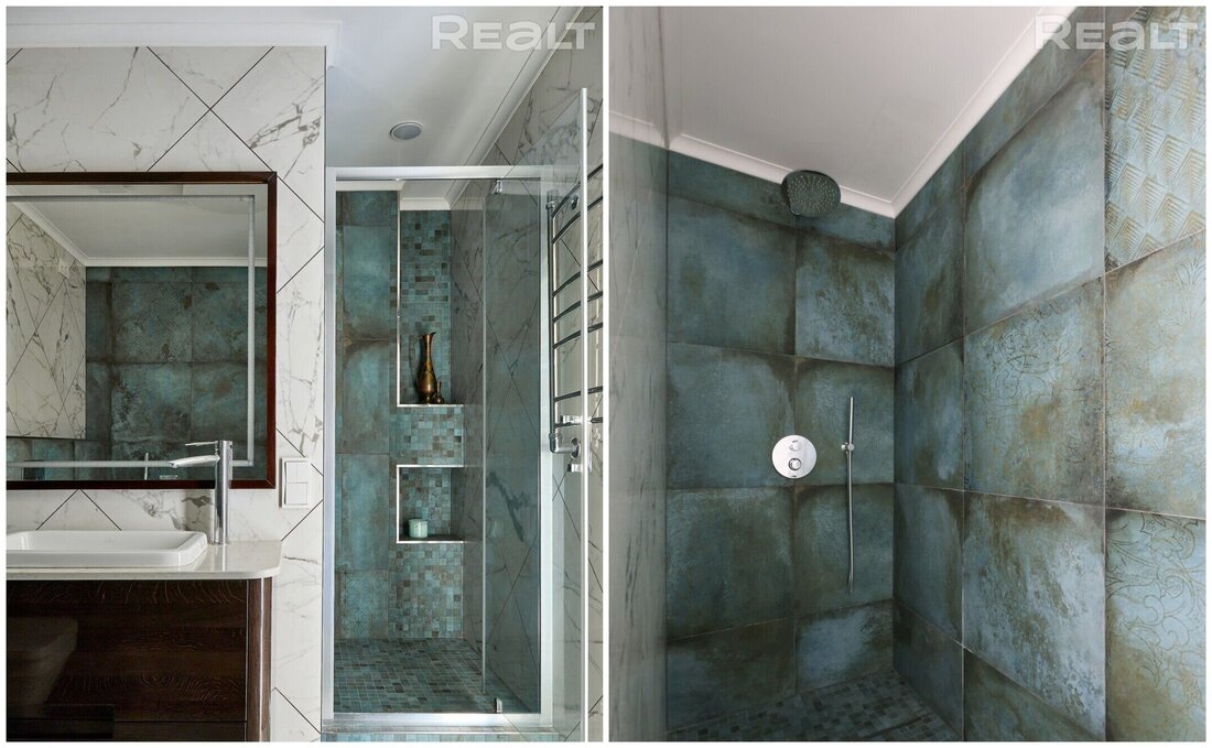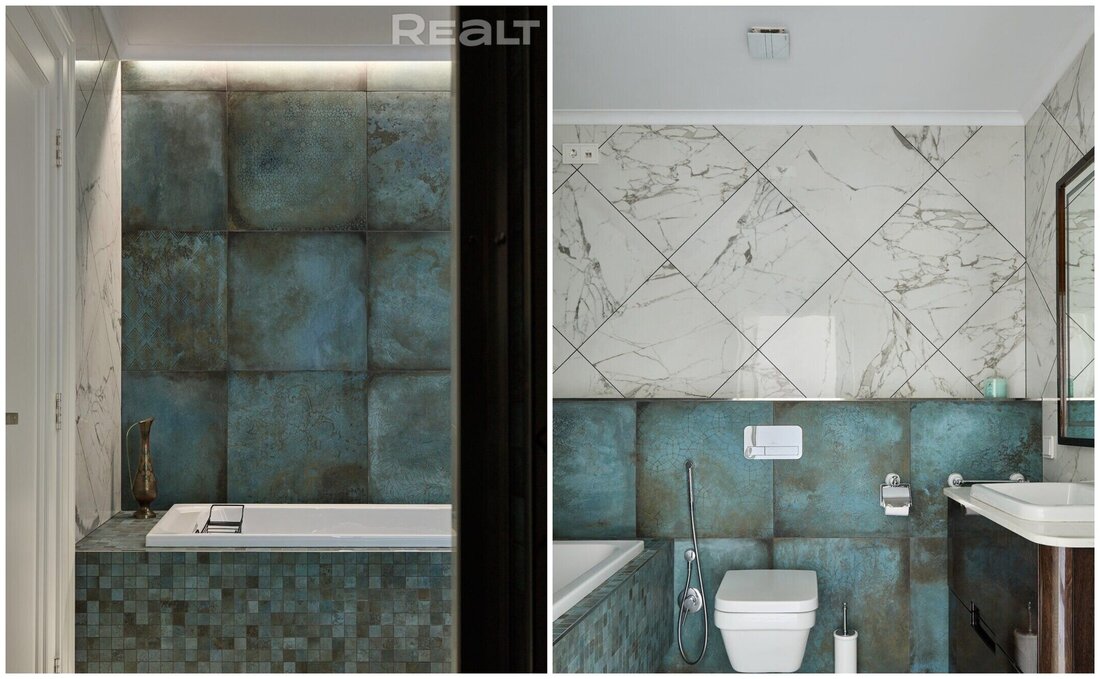Санузел здесь совмещенный, облицован плиткой. Размеры позволили разместить и ванну, и душ.