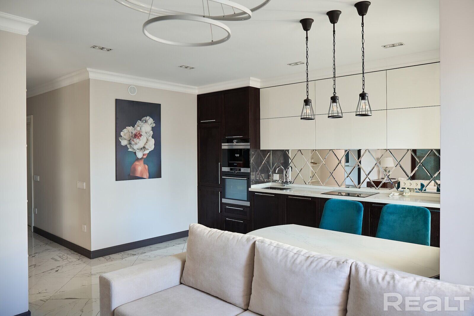 Нашли красивую квартиру в высотке, что стоит на берегу Свислочи. Жилье занимает больше 60 квадратов, которые распределили между совмещенной кухней-гостиной и спальней. Все зоны получились просторными, что позволило реализовать многие «хотелки». Например, в санузле есть и ванна, и душ. Показываем эту квартиру.