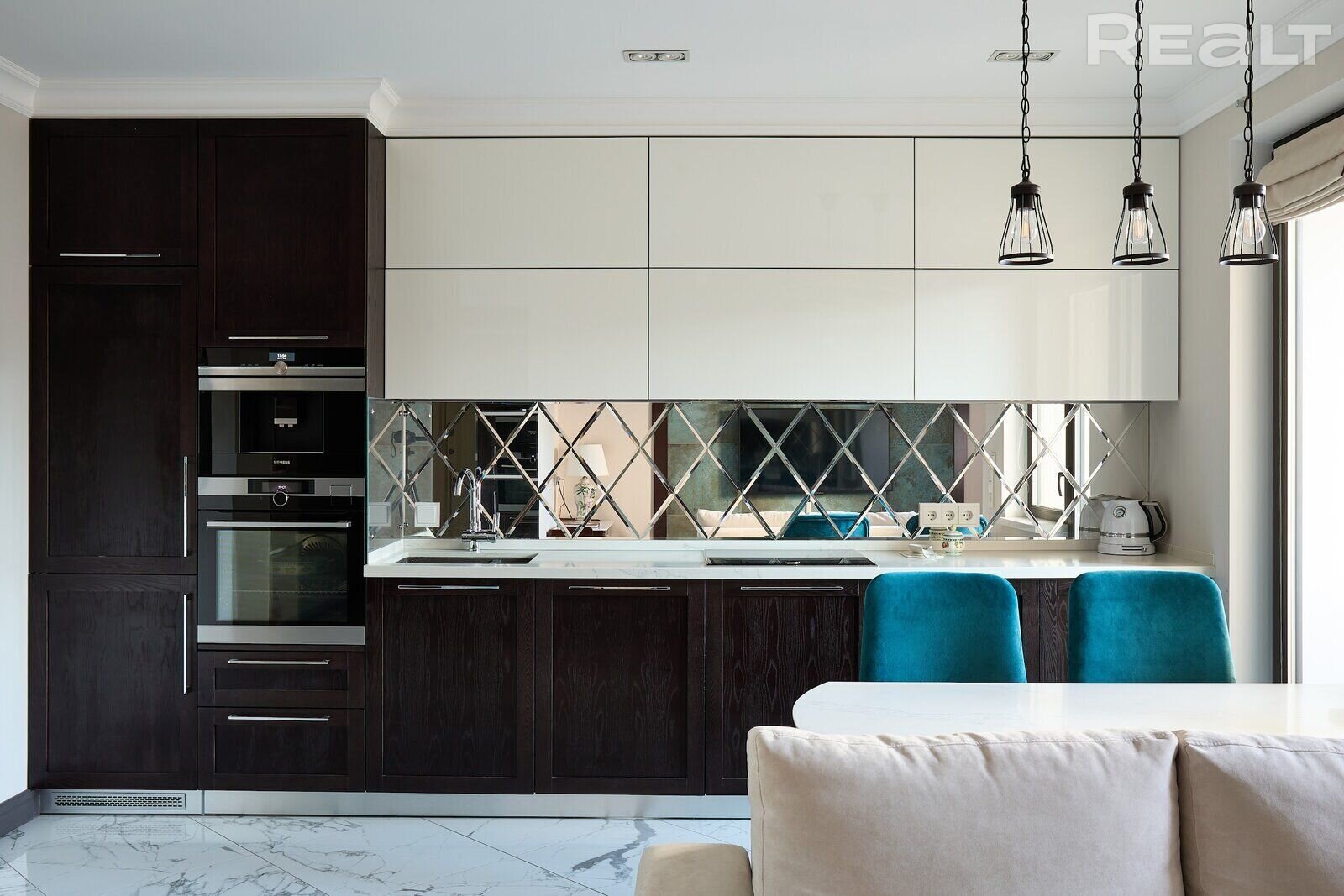 Квартира оборудована всей необходимой бытовой техникой NEFF: есть духовой шкаф, варочная поверхность, вытяжка, стиральная машина, кофемашина. Также тут сделана круговая звукоизоляция. Балкон утеплен. Полы идут с подогревом.