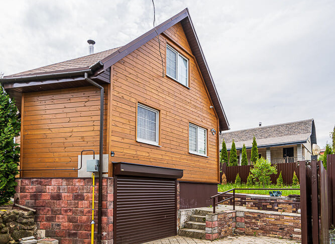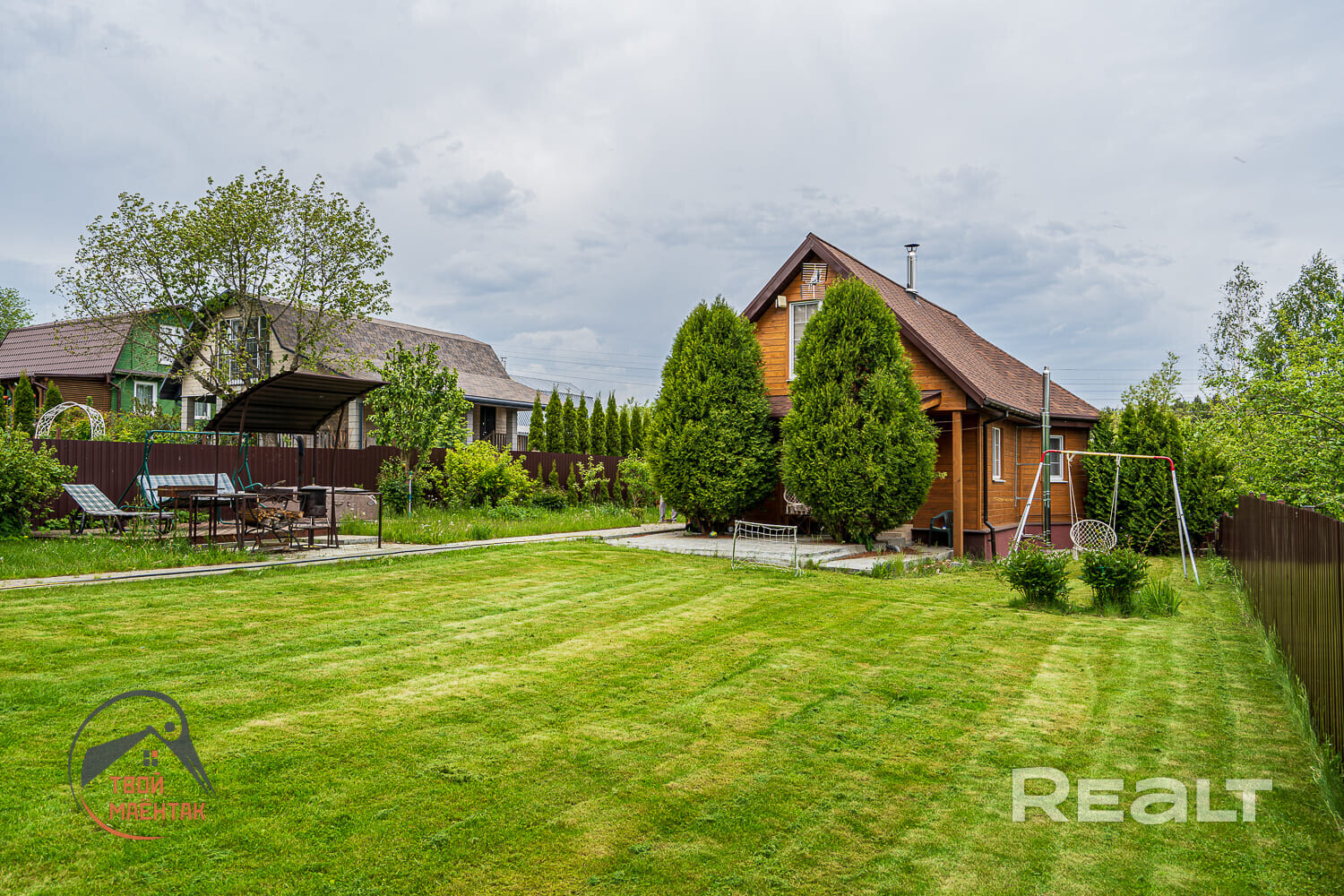 Дом располагается на участке в 7 соток. На территории имеется баня с купелью, зона барбекю с беседкой, небольшое футбольное поле и парковка для машины.