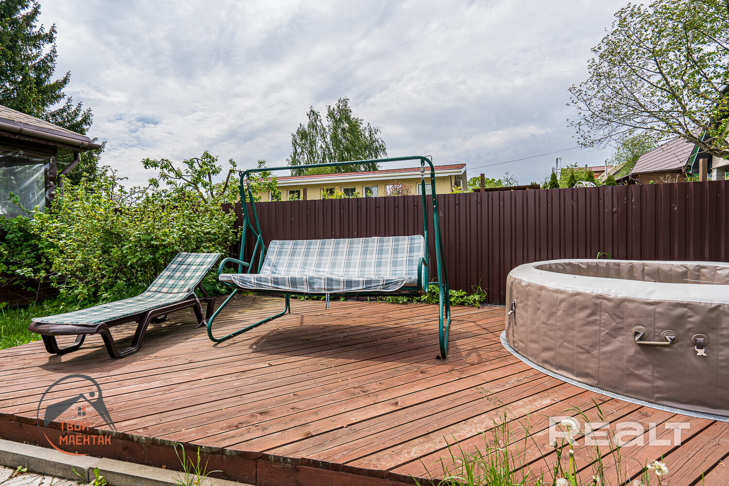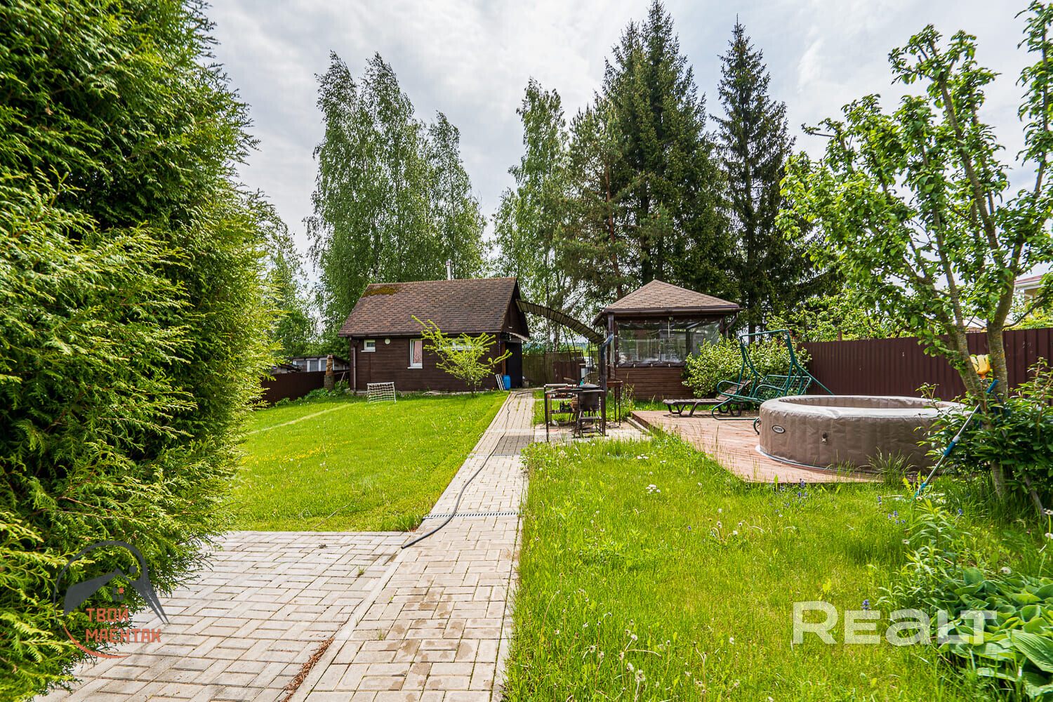 На участке выполнен ландшафтный дизайн — земля покрыта газонной травой, по периметру высажены высокие туи. Есть и дорожки из тротуарной плитки.