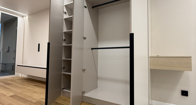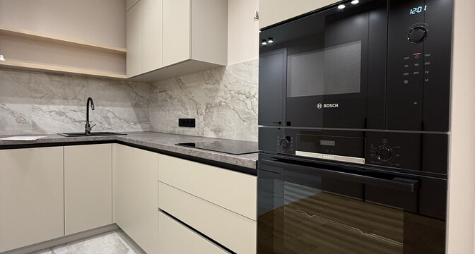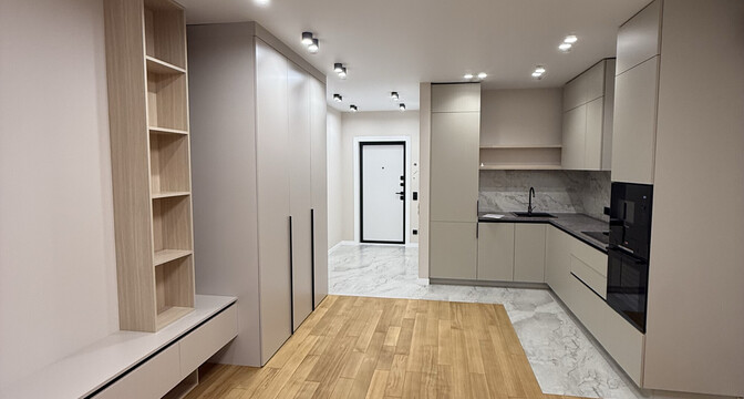 Здесь общая площадь — 41 квадрат. На полу уложен паркет и плитка. Потолки натяжные. Есть спальное место — двуспальная кровать и два шкафа. В кухне из техники посудомоечная машина, варочная поверхность, вытяжка фирмы Weissgauff, холодильник Samsung и стиральная машина. Фасады выполнены из крашеного МДФ белого цвета, а столешница — из искусственного камня. В кухне есть выход на застекленную лоджию. Санузел совмещенный.