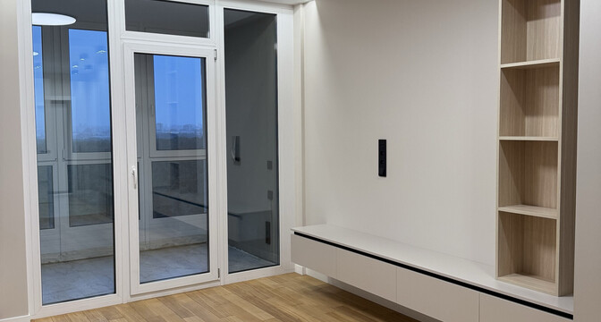 Общая площадь студии — 38 метров. Ремонт светлый и лаконичный. Уложен дубовый паркет и сделаны теплые полы. Установлен кондиционер. Вся техника в квартире от бренда Bosch. Санузел совмещенный. Есть застекленная лоджия.
