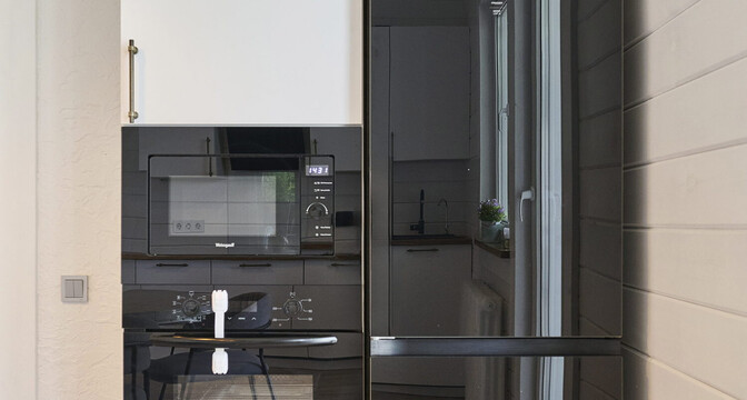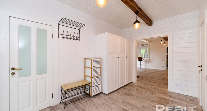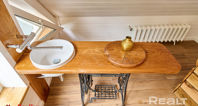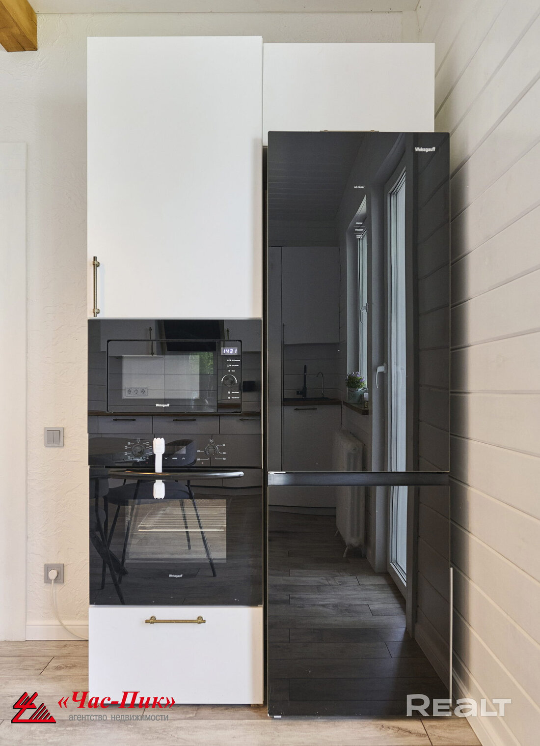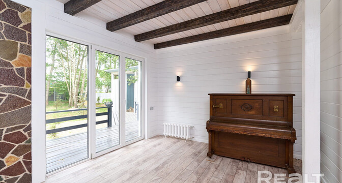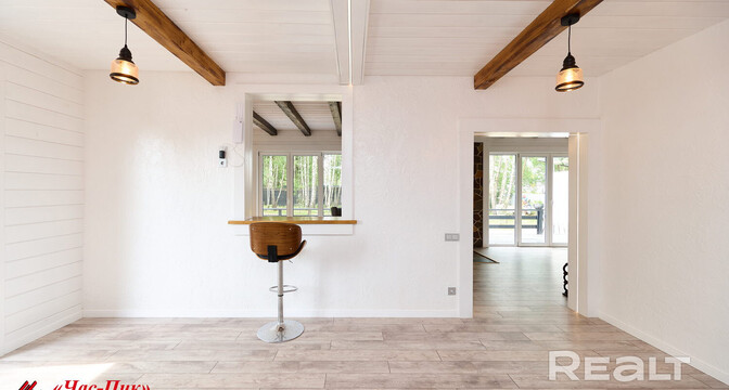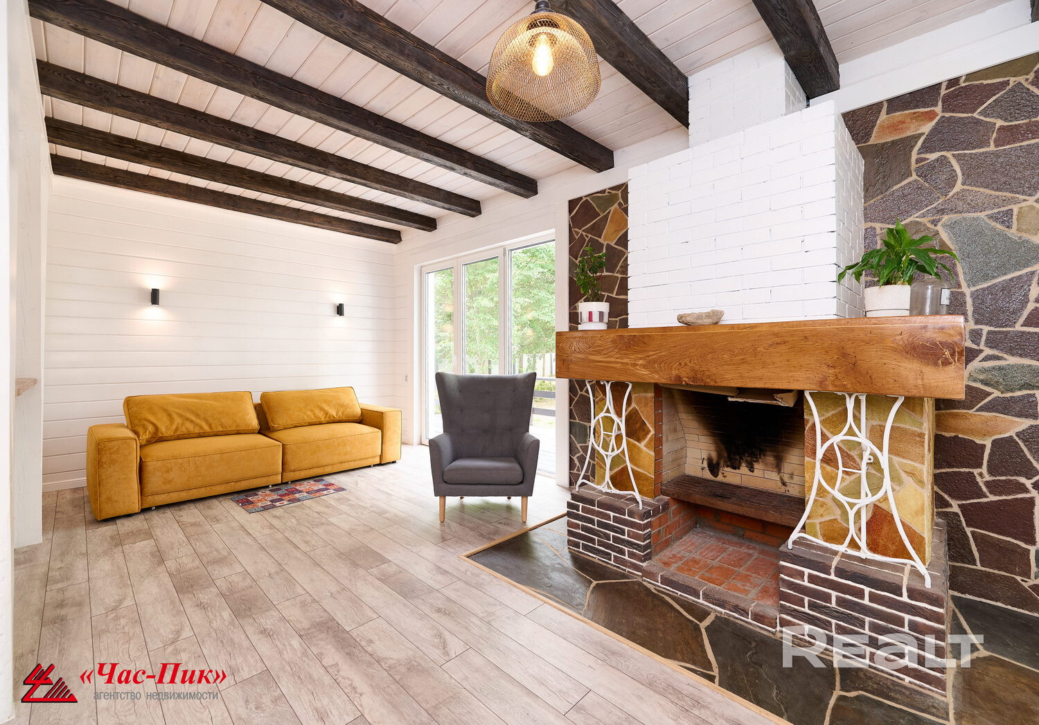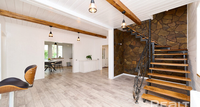 Дом двухэтажный с ремонтом, меблированный. На первом этаже разместились две гостиные, отдельная кухня, санузел и топочная. На полу лежат ламинат, плитка. Мебель выполнена из массива.