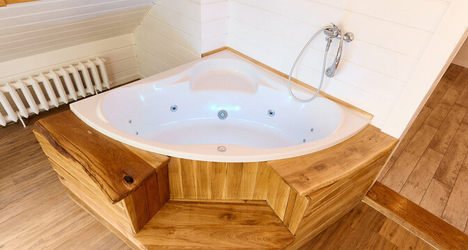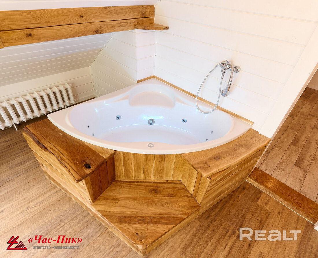 На первом этаже сделана и сауна. Вода поступает из центрального водопровода, канализация — автономная. Отопление тут электрическое, но введен и газ. Помогает и камин в гостиной.