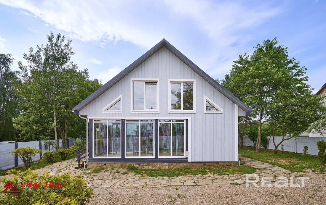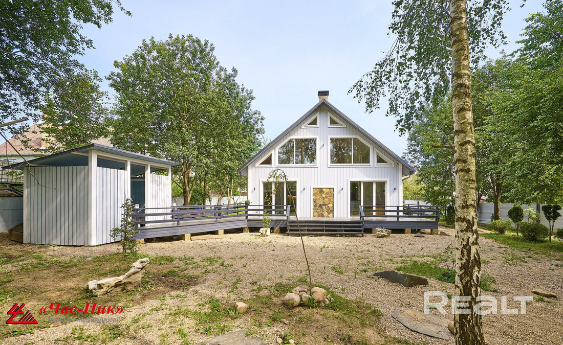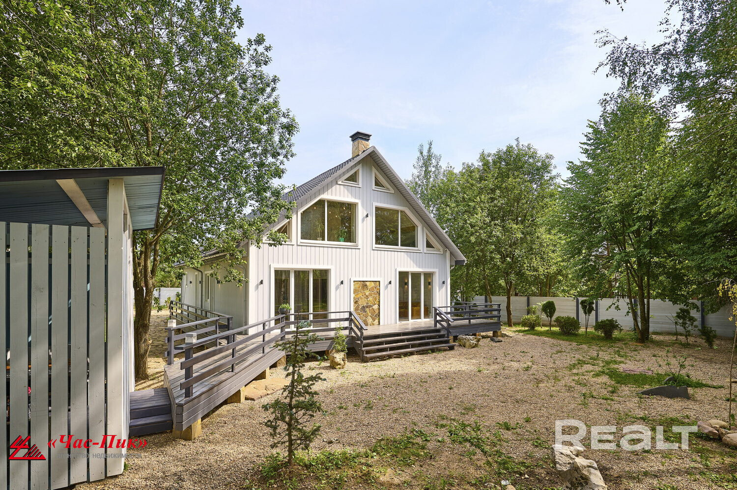 В Колодищах продается современный каркасный дом. Внутри — светлый интерьер, много больших окон, а на втором этаже — просторные спальни с ванными. Хорош и сам участок: дом, беседка и детская площадка вписаны в березовую рощу. Оцените коттедж. Ниже пишем и стоимость.