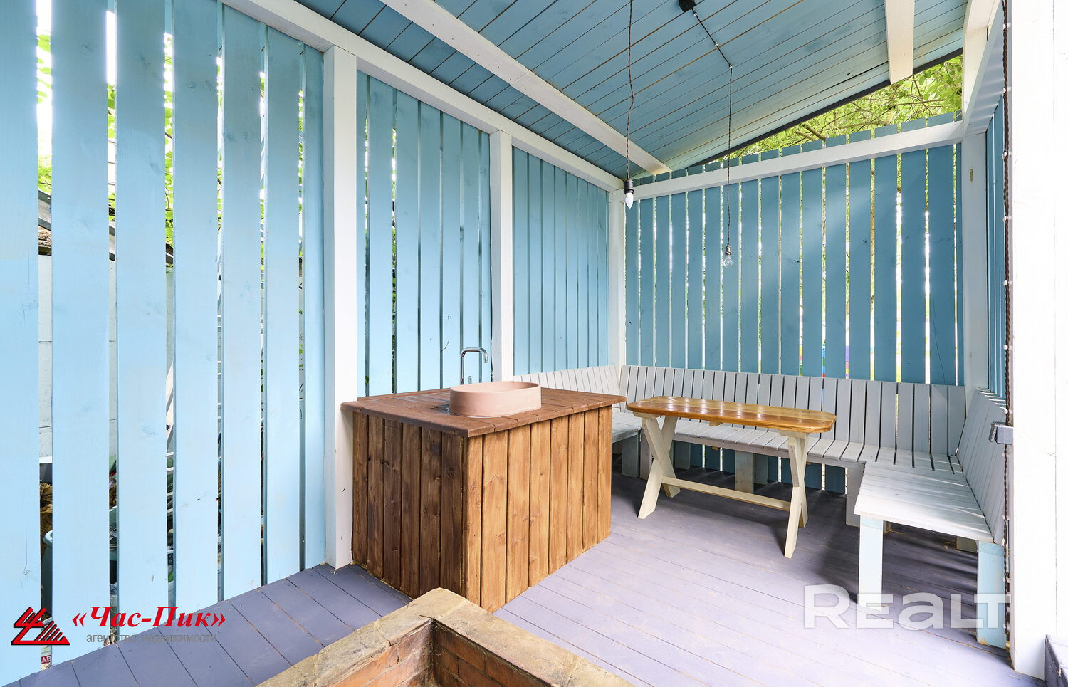 К дому прилегает терраса, которая соединяет дом с беседкой. Кстати, сюда тоже подведена вода.