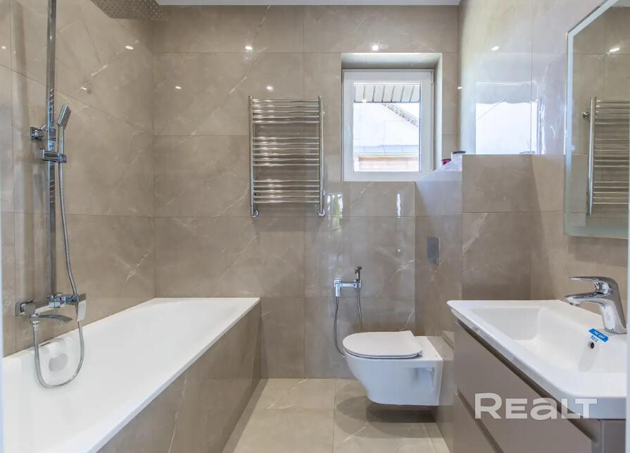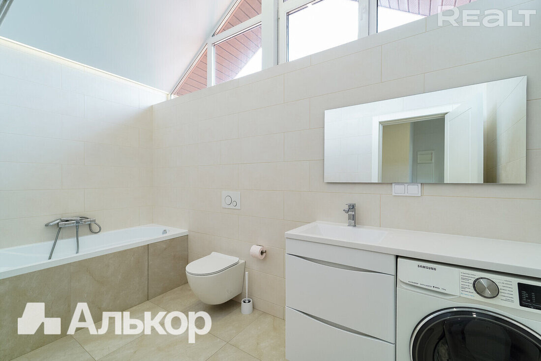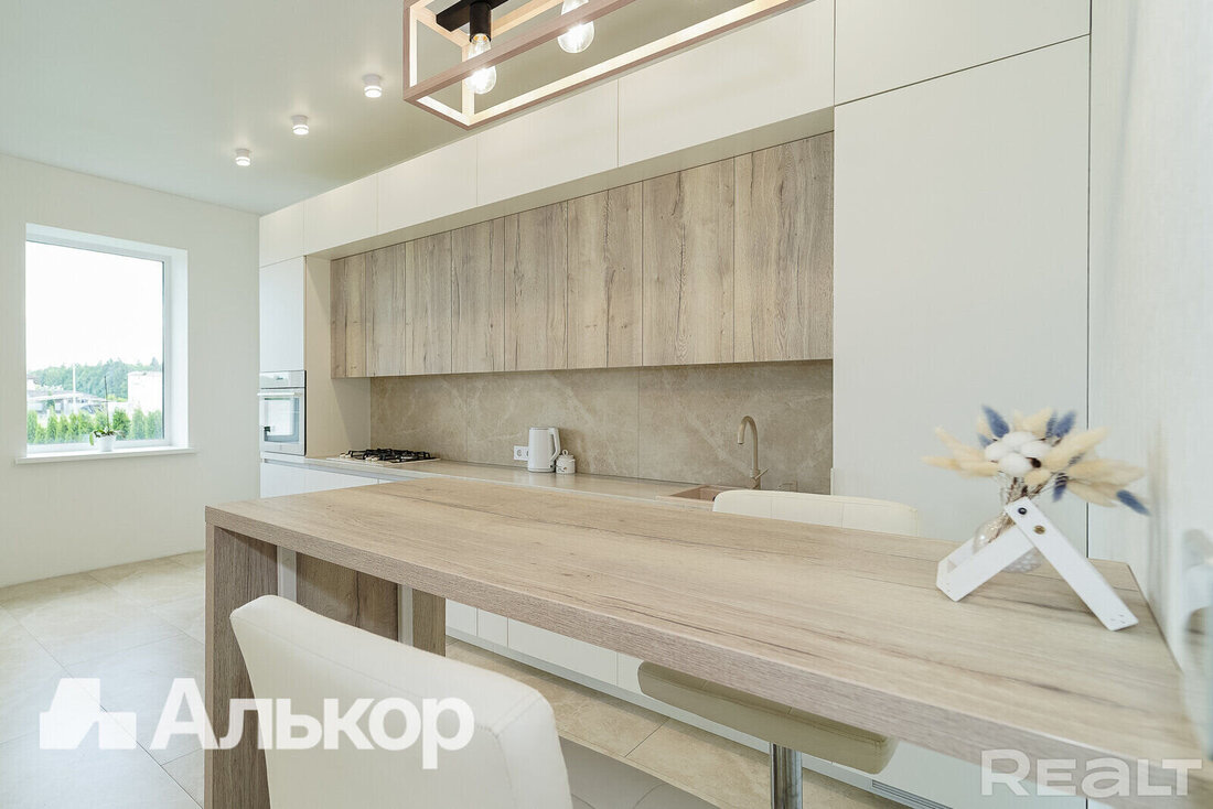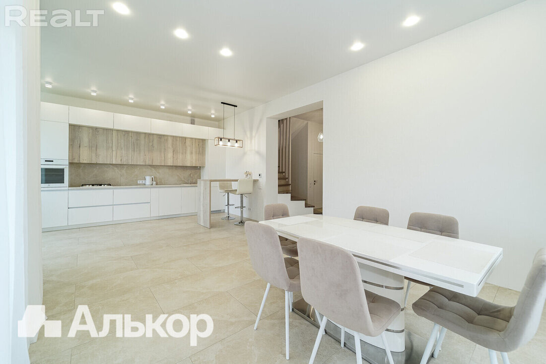 Здесь продается двухэтажная квартира в блокированном доме. При строительстве дома делался акцент на энергосбережении, толщина стен составляет 50 см. Во всех комнатах реализована система теплых полов и уложена плитка. Общая площадь — 220 квадратов.