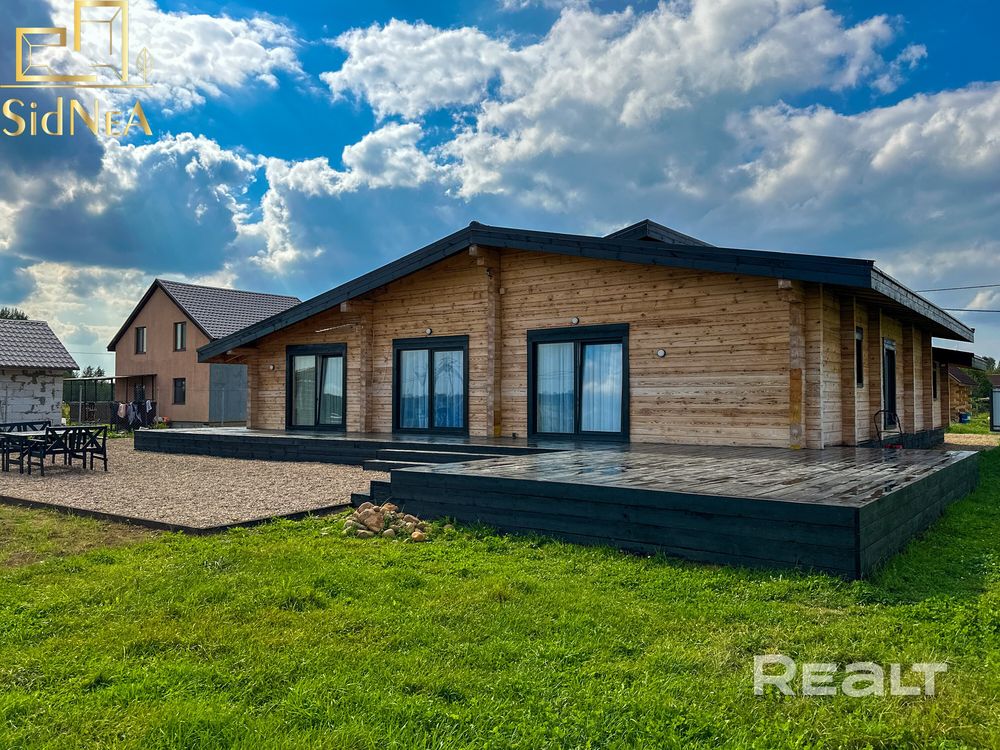 Дом построен в 2023 году, фундамент свайный, стены – из профилированного бруса. Строение одноэтажное, общая площадь 137,5 м2. Планировка следующая: просторная кухня-гостиная, совмещенный санузел, три спальни.