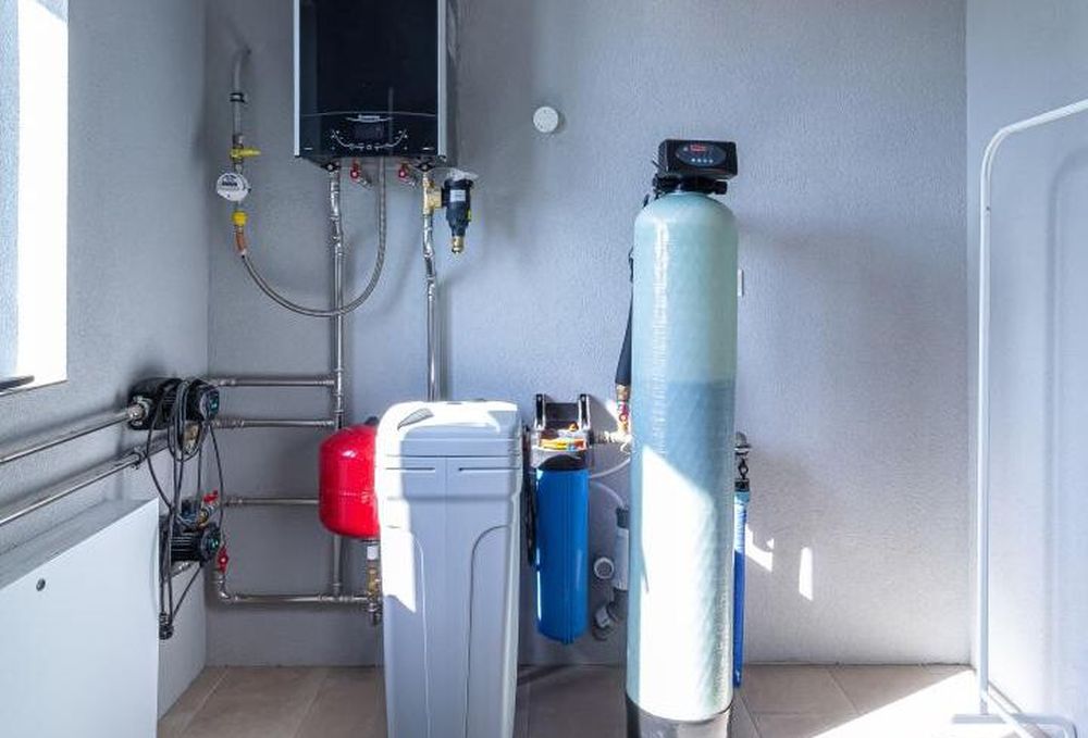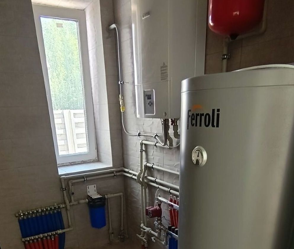 Отопление на газу (установлен котел Bosch, водонагреватель Ferroli на 300 л). Водопровод центральный, канализация местная.