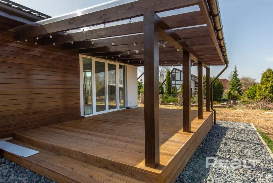 Коттедж построен по современному проекту — одноэтажный, с вальмовой крышей. Под ним монолитная плита, стены — из газосиликатных блоков. Фасад частично отделан планкеном из лиственницы со скрытым крепежом, частично — декоративной штукатуркой Ceresit.