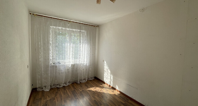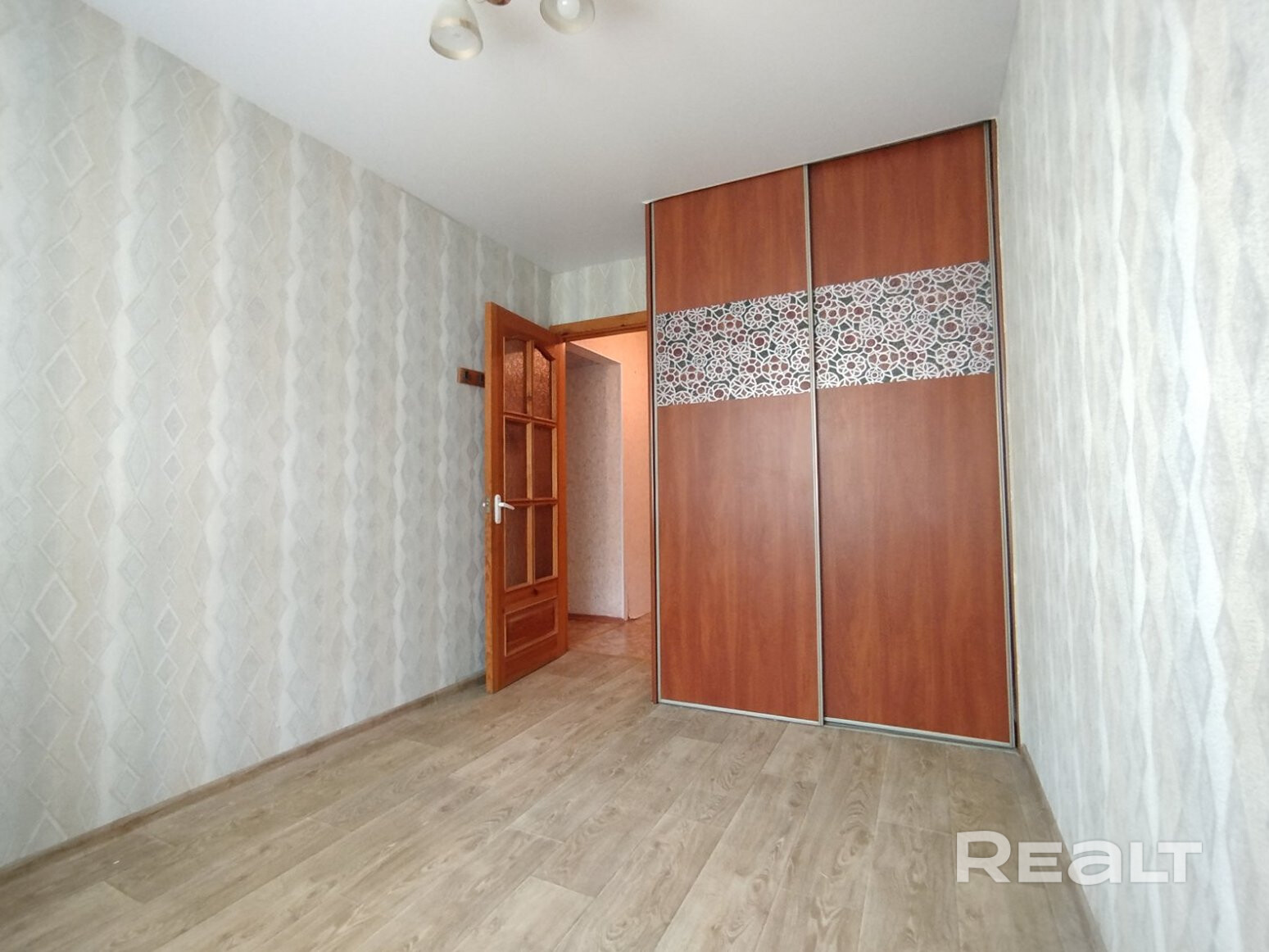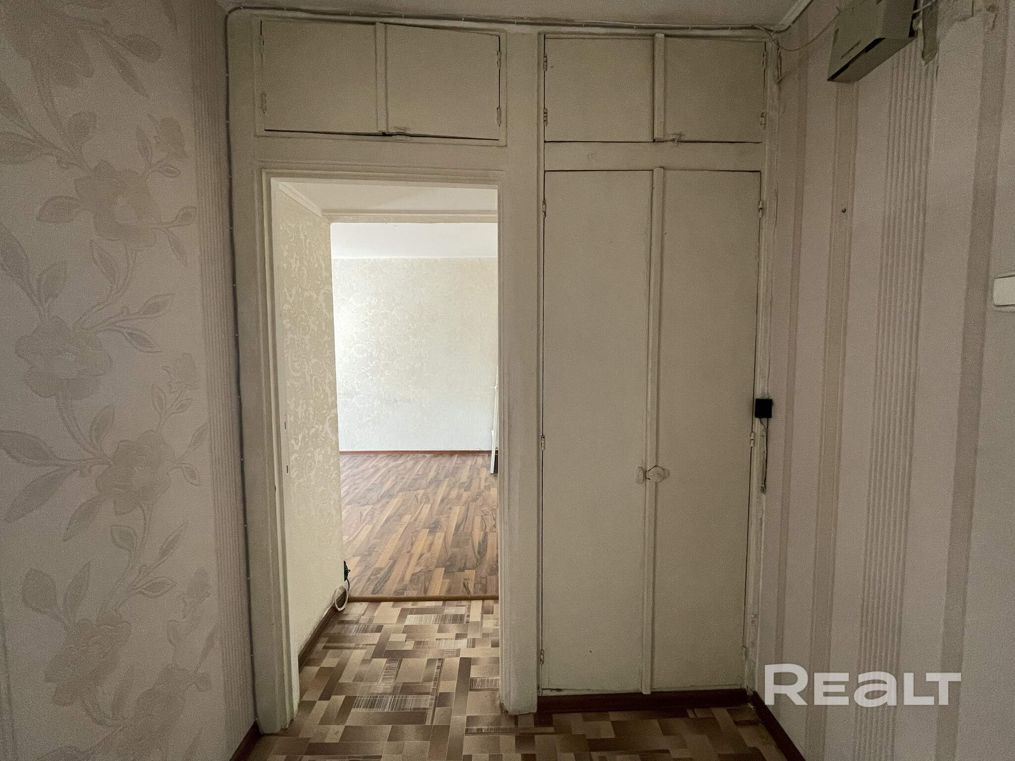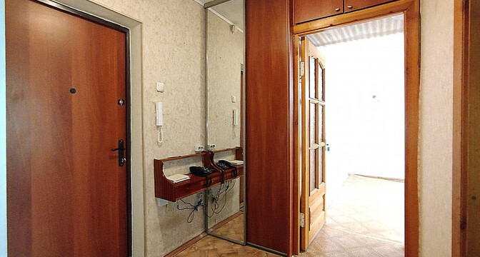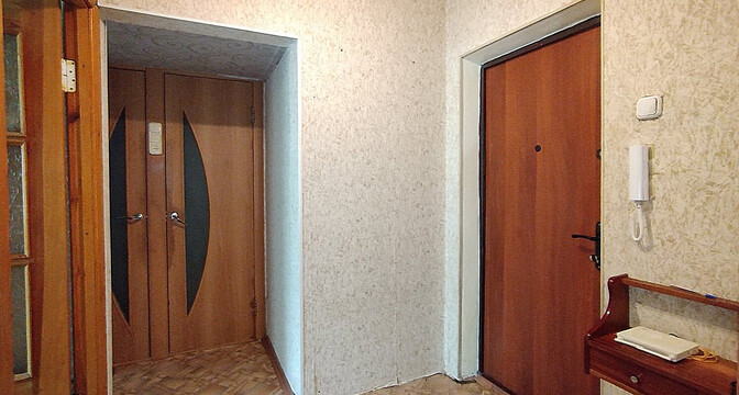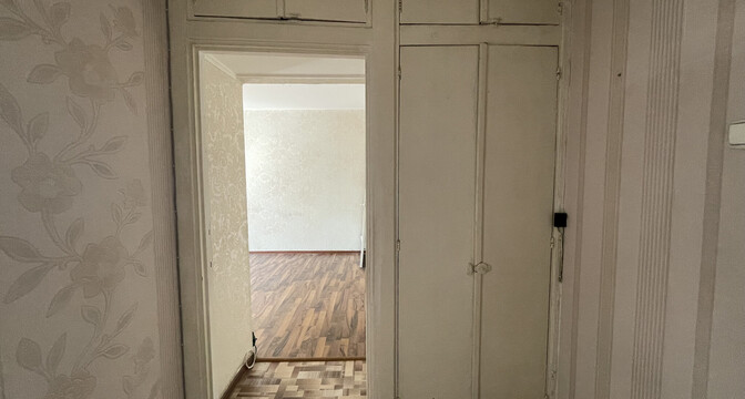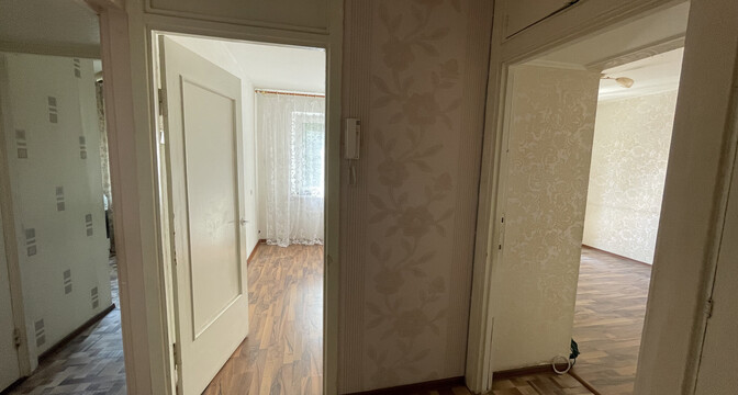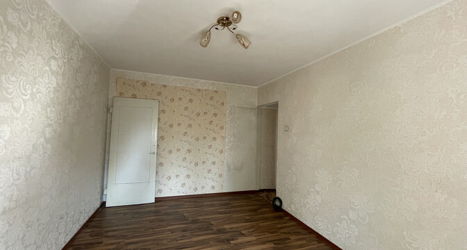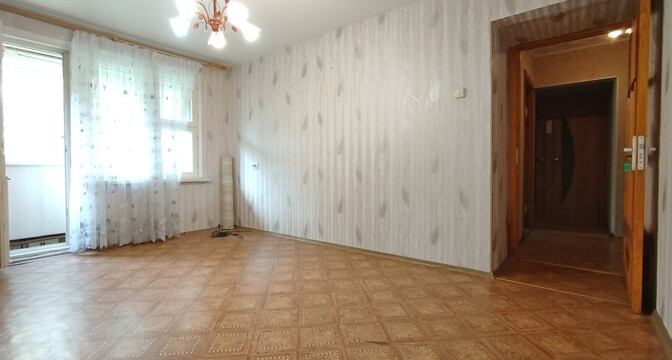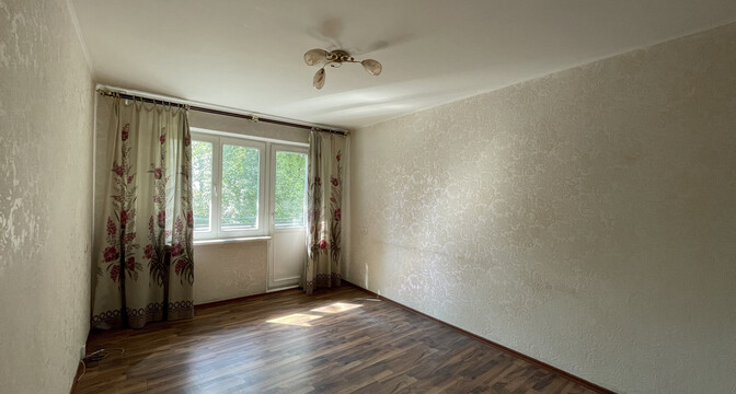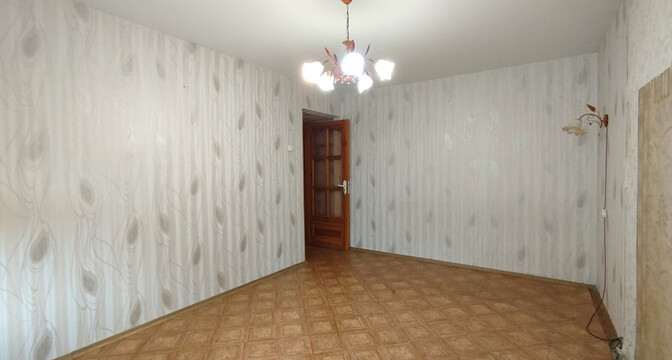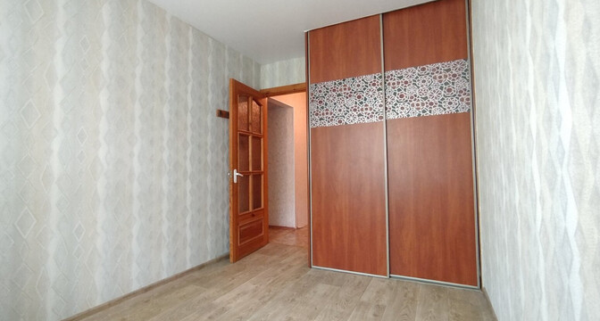 Квартира требует некоторых обновлений. Здесь стоят стеклопакеты, лежат линолеум и плитка. Две изолированные комнаты освободили от мебели и техники. В коридоре есть встроенные шкафы. Из комнаты сделан выход на открытый балкон.