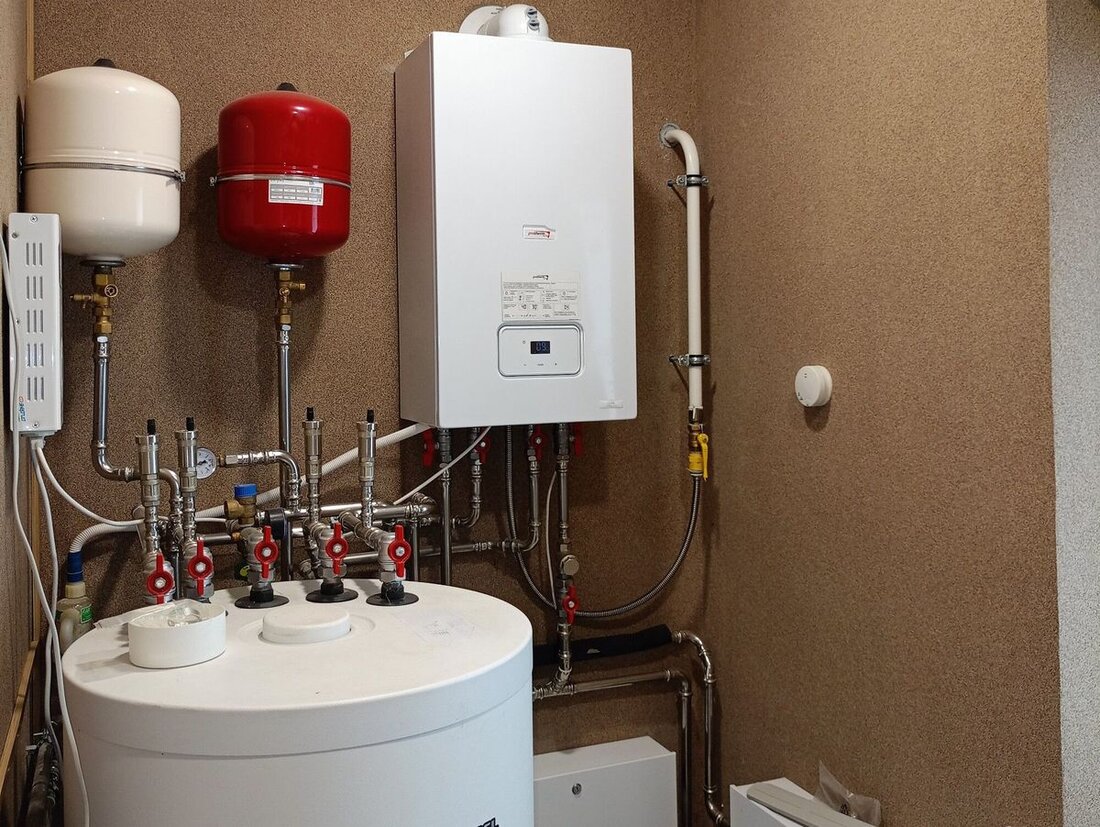 Отапливается дом газовым котлом с бойлером косвенного нагрева. Вода из скважины, канализация местная — септик с фильтрационной системой.