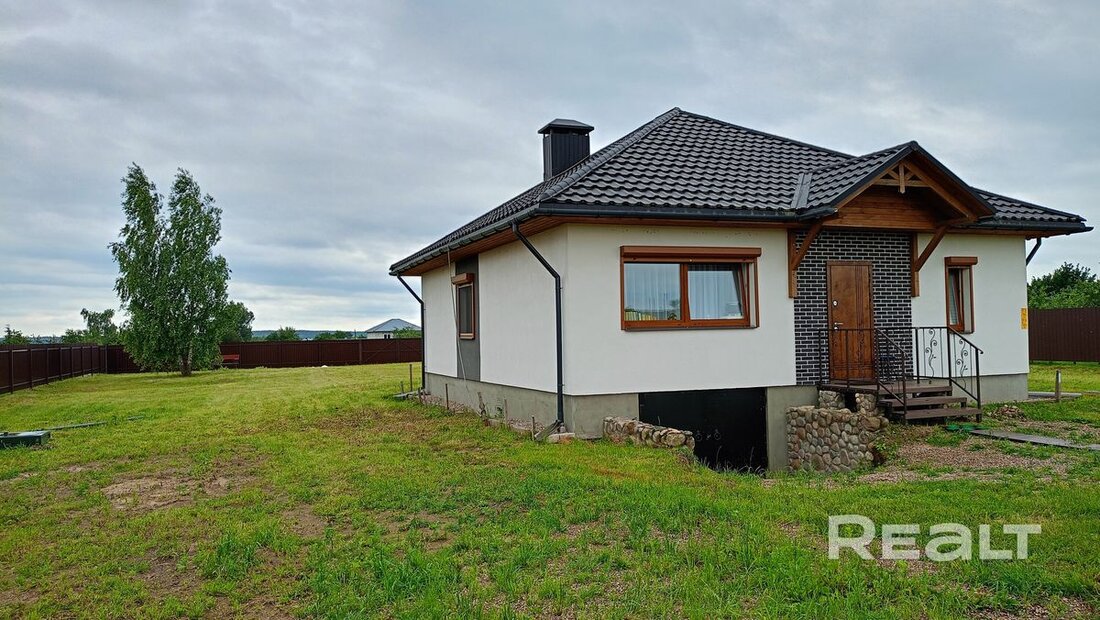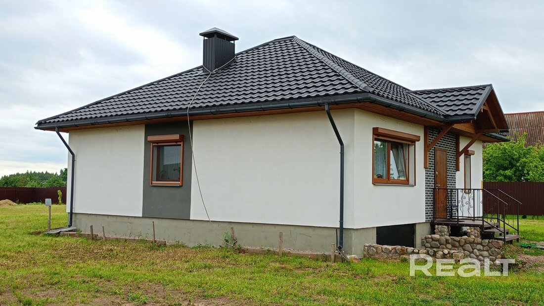 Строение новое, работы в нем закончили в этом году. Стены из блоков, утеплены, оштукатурены, окрашены. Перегородки — кирпичные. Судя по фото, под домом имеется цокольный этаж, который можно использовать как гараж или хозпомещение. Окна ПВХ, установлены рольставни и москитные сетки. На крыше — металлочерепица.