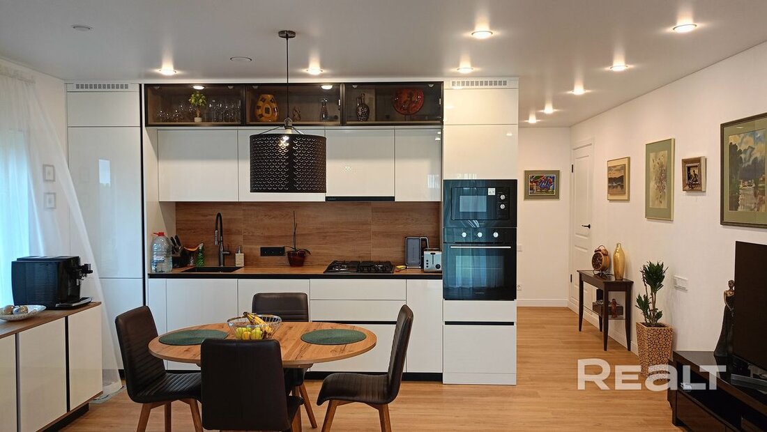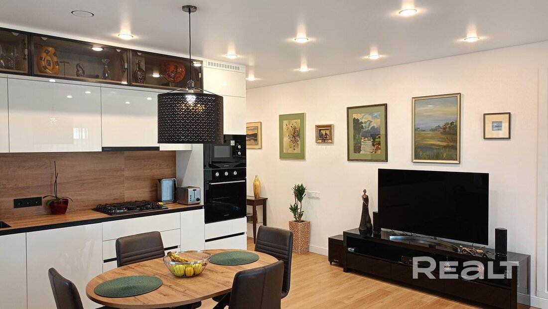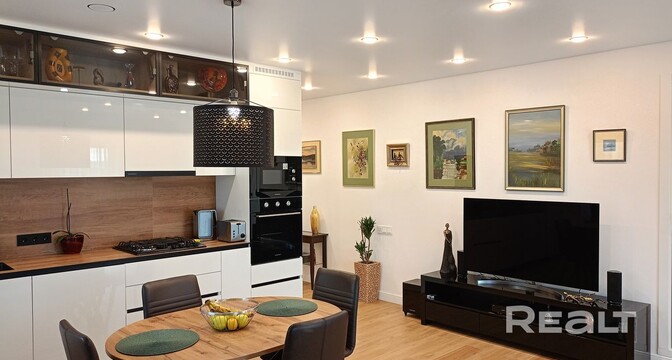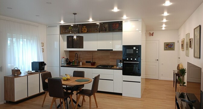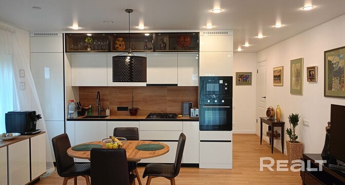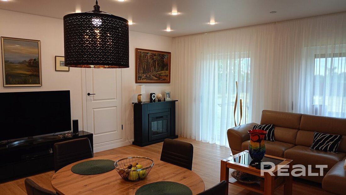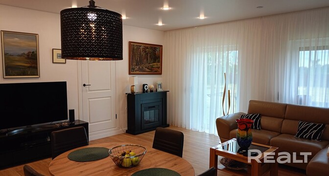 Компактный не равно тесный: дома до 100 квадратов с продуманной планировкой не менее функциональны строений гораздо больших по площади. Как пример — коттедж в 33 километрах от Минска: в нем каждый квадрат на счету, но места хватило для трех жилых комнат, гостиной-кухни, санузла и подсобных помещений. В плюсах этого варианта — стильный интерьер, современные мебель и бытовая техника. То есть можно заезжать и сразу жить. Стоимость, кстати, вполне адекватная.