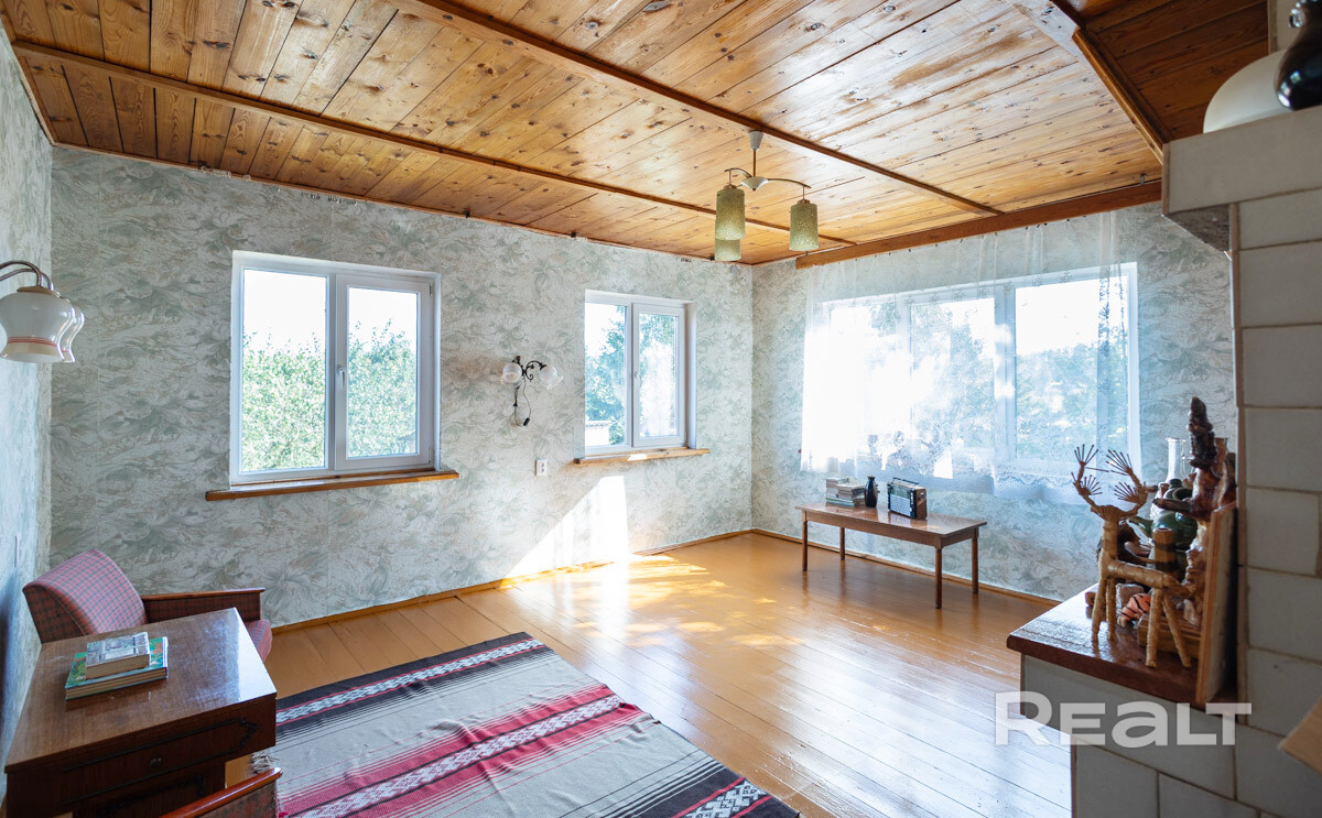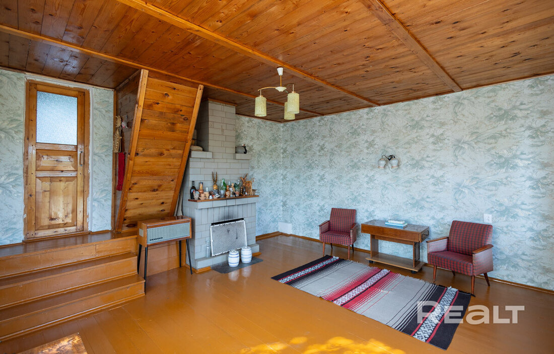 На первом этаже дома расположилась кухня, а также гостиная. Пол и потолок здесь обшиты деревом. Обстановка внутри — ламповое ретро с вещами советской эпохи. При этом интерьер не выглядит перегруженным. Все сделано аккуратно и поддерживает общую стилистику загородного дома. Отмечается, что в комнатах поклеены свежие обои.
