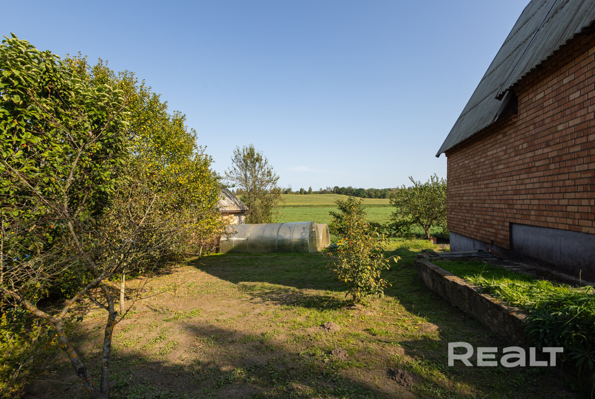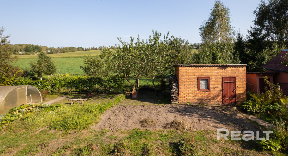 Стоит дом на участке площадью в 6 соток. Надел примыкает к полю, из окон открывается красивый вид. Есть тут и местечко для отдыха, и грядки.