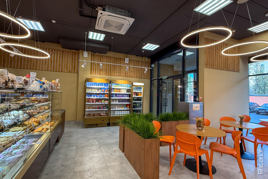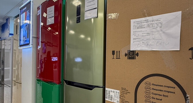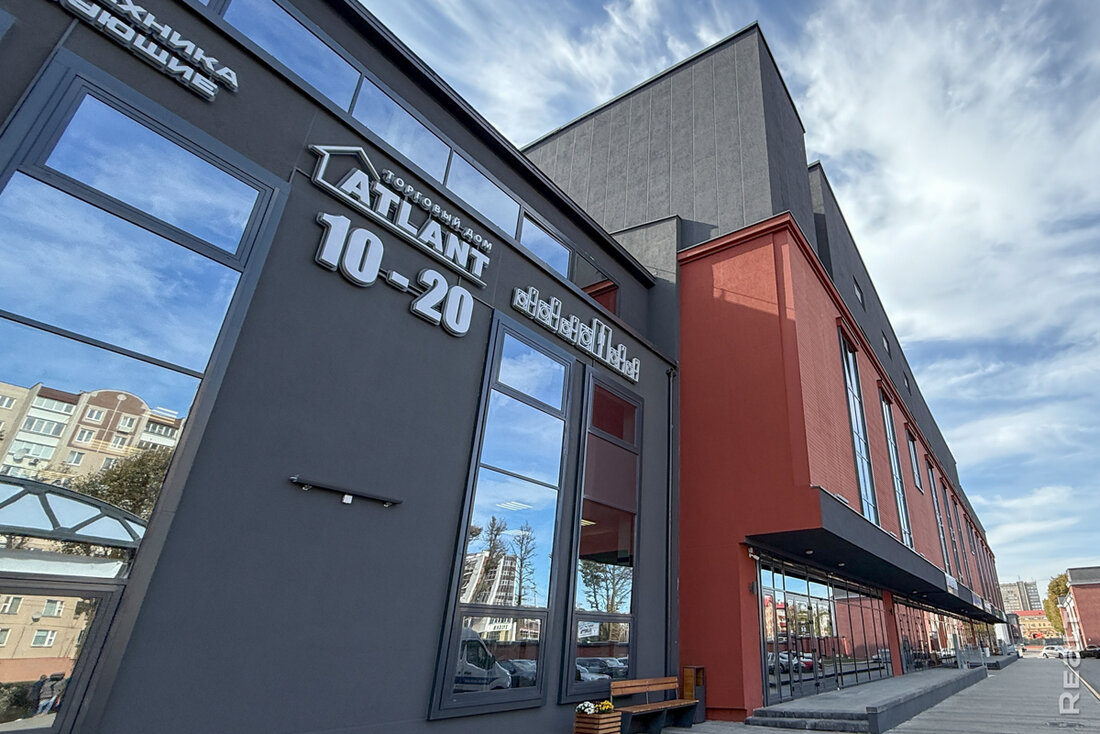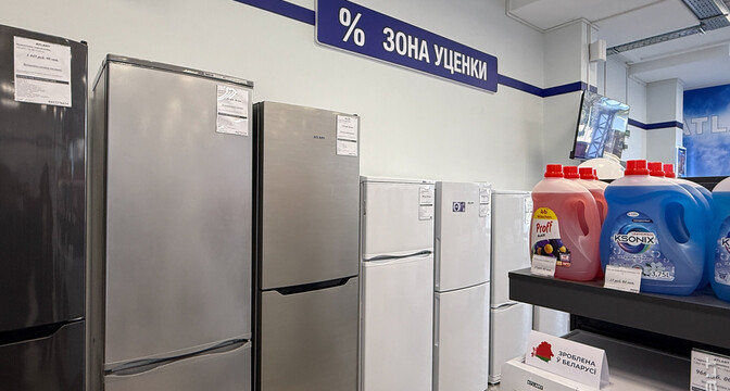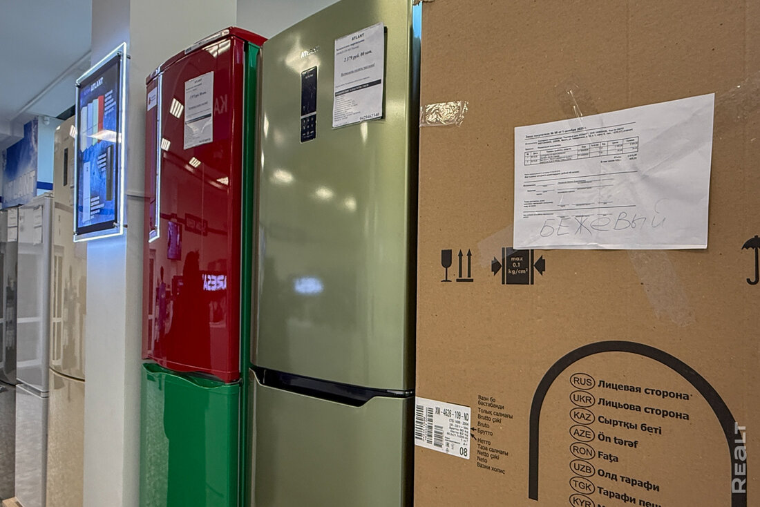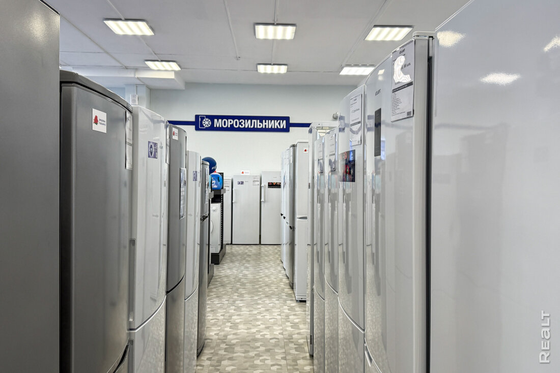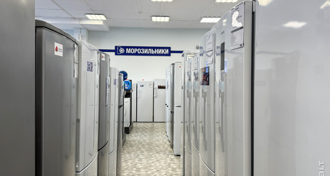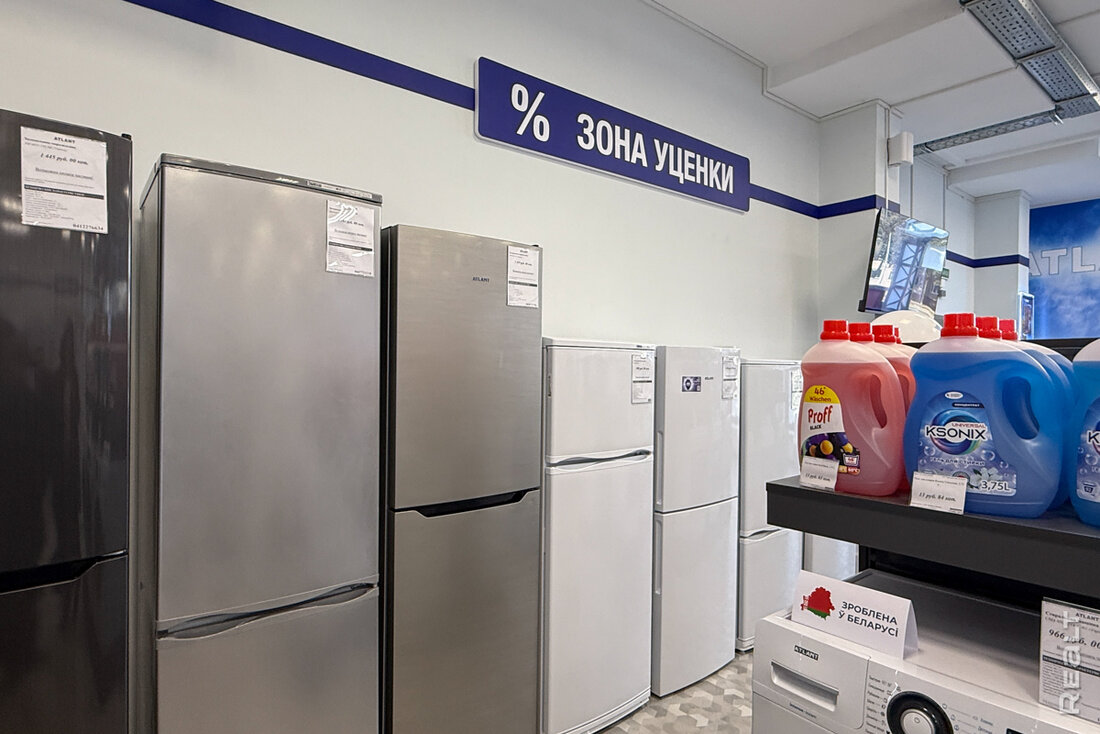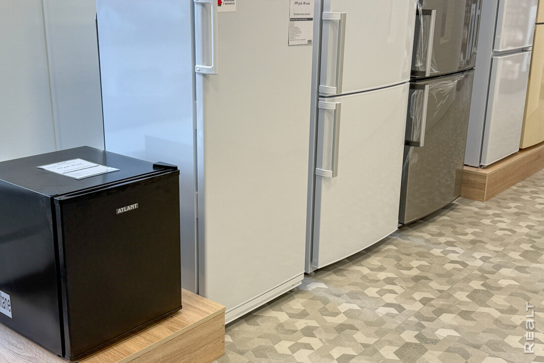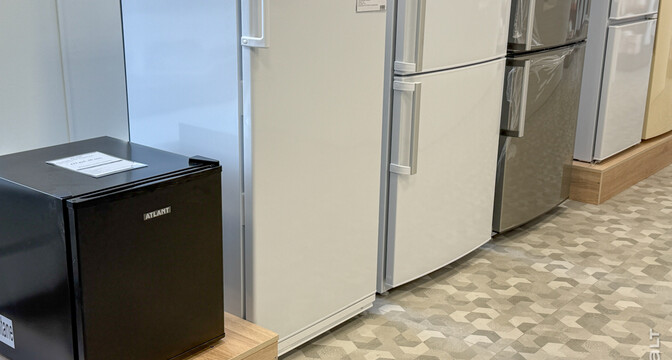 Сейчас в квартале работает несколько магазинов и кафе. Мы начнем с большого магазина «Атлант». Здесь продается разная техника, комплектующие, можно найти что-то по мелочи. Отдельно есть зона уценки. Здесь выставлены позиции со скидками. Например, один из холодильников продается после ремонта. Стоит 1 445 рублей. Эта же модель есть в магазине и новая — за 2 147 рублей.