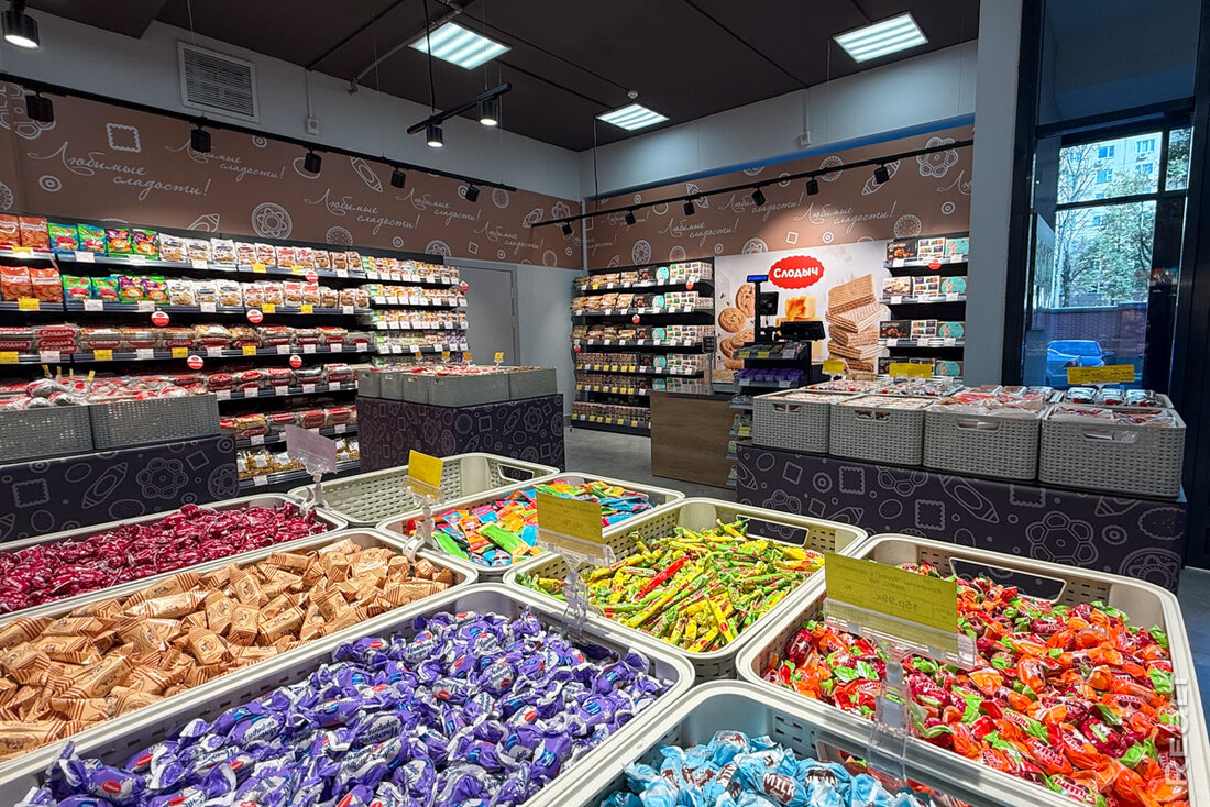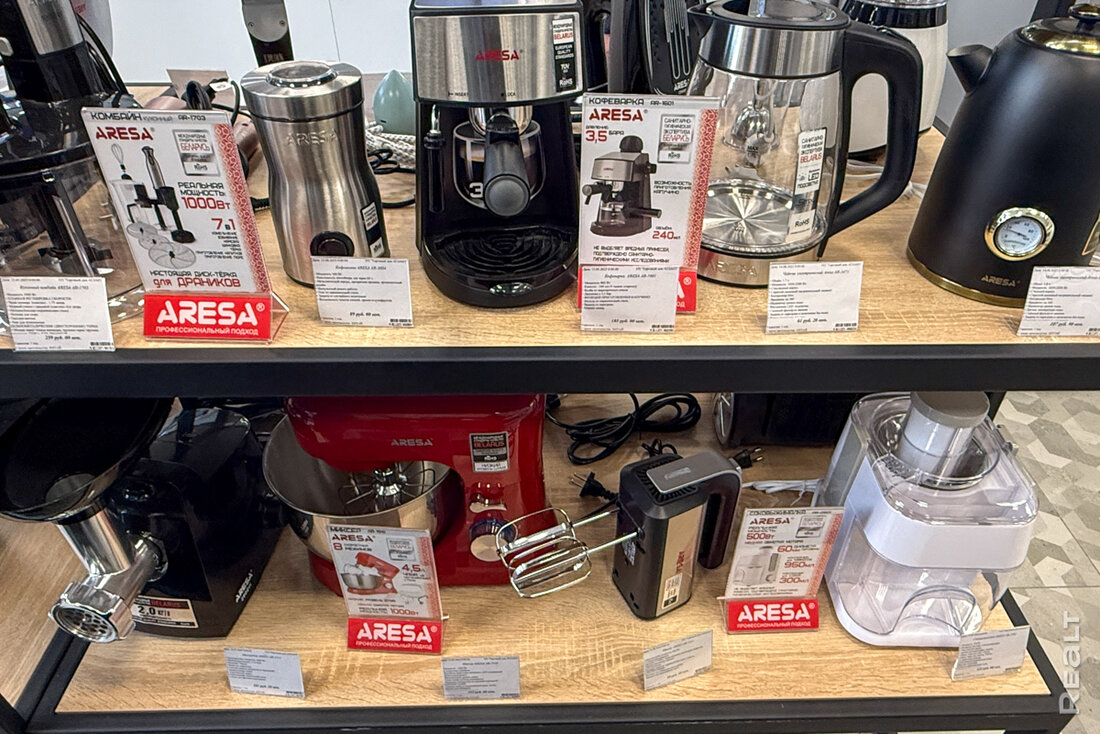 Большинство товаров, представленных в магазине, от «Атлант» — стиральные машины, холодильники, микроволновки, но есть мелкая бытовая техника бренда Aresa. Кроме этого, продаются сковородки и бытовая химия.
