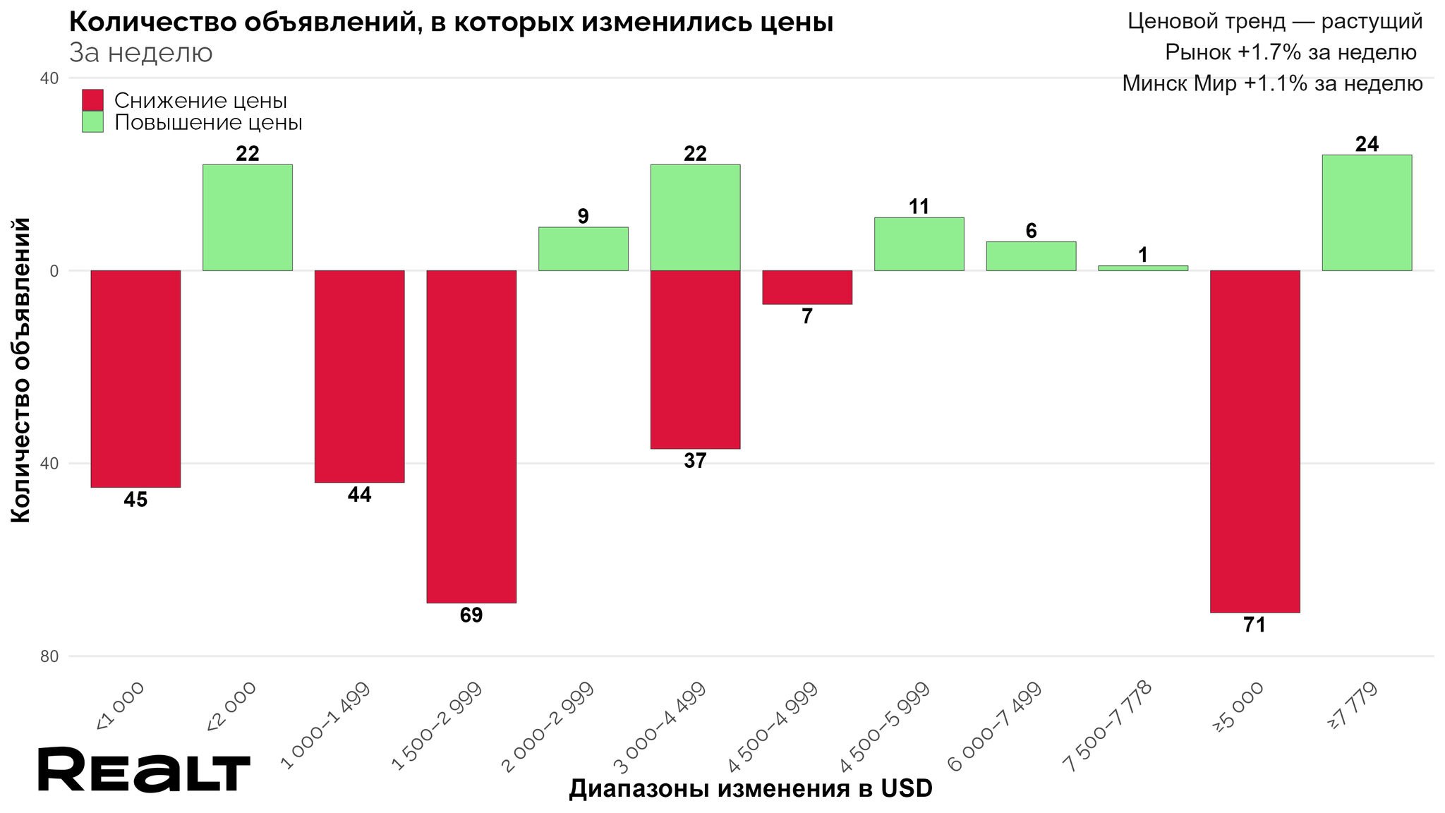 За прошлую неделю подешевело 317 квартиры в среднем на 1000−5000 долларов это около 7% от всего предложения. В то же время 130 квартир в продаже (около 3%) стали дороже в среднем на 1600−7000 долларов.