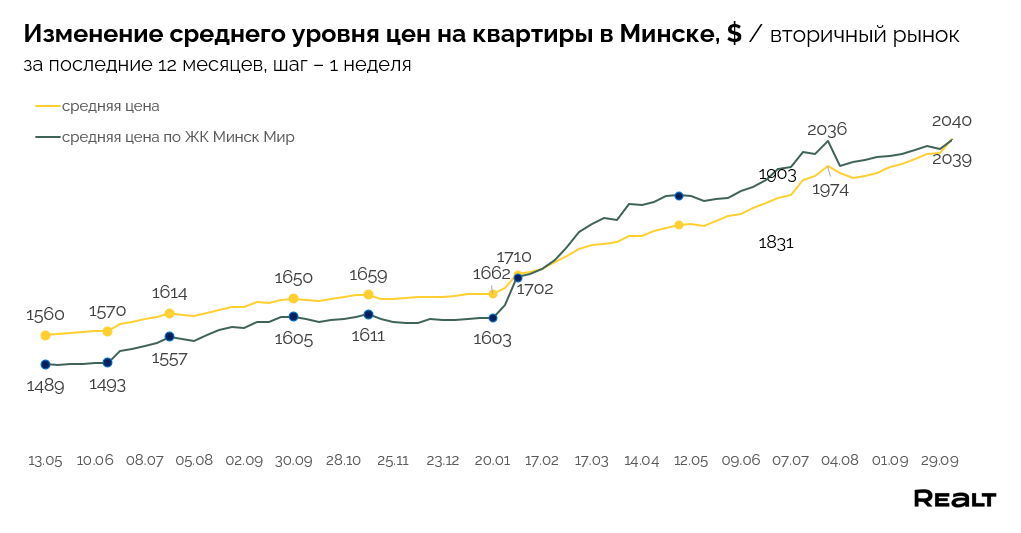 В результате, за последнюю неделю мы видим, что средняя стоимость кв. м. в рамках недели подросла на 1.7% до 2040 $/м2. Цена кв. м. на квартиры в Минск-Мире также поднялась на 1.2% и достигла 2039 $/м