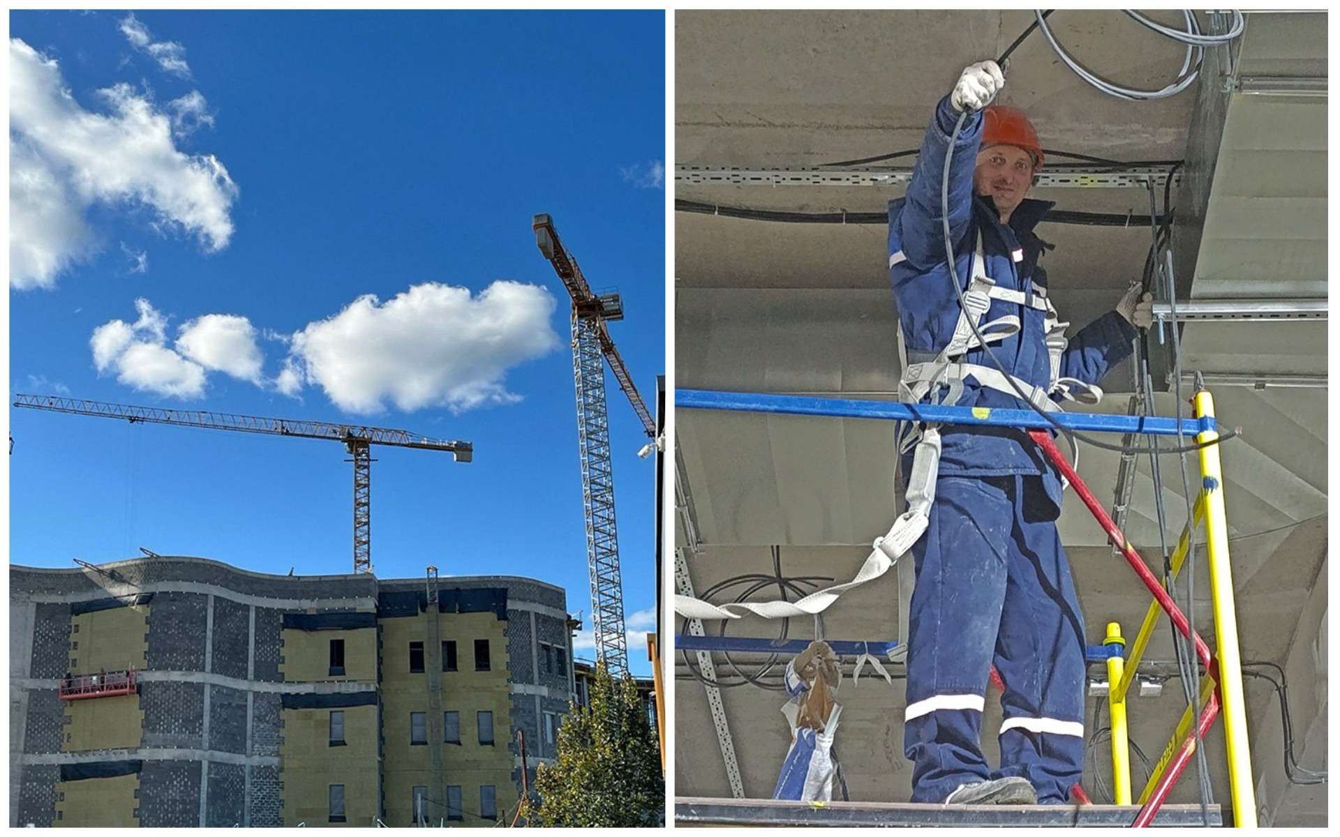 Внутри здания каменщики и штукатуры работают параллельно с монтажниками, которые проводят черновые электромонтажные и сантехнические коммуникации, а также заливают стяжки полов.