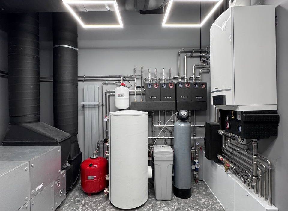 Комфортный температурный режим летом обеспечивает система кондиционирования LG. За отопление же отвечает конденсационный газовый котел Buderus мощностью 72 кВт (при потребности 47 кВт). Как и в случае с вентсистемой, у него большой запас по мощности. Логика в этом такая — оборудование не работает на износ, что гарантирует больший ресурс и минимизирует необходимость частого обслуживания.