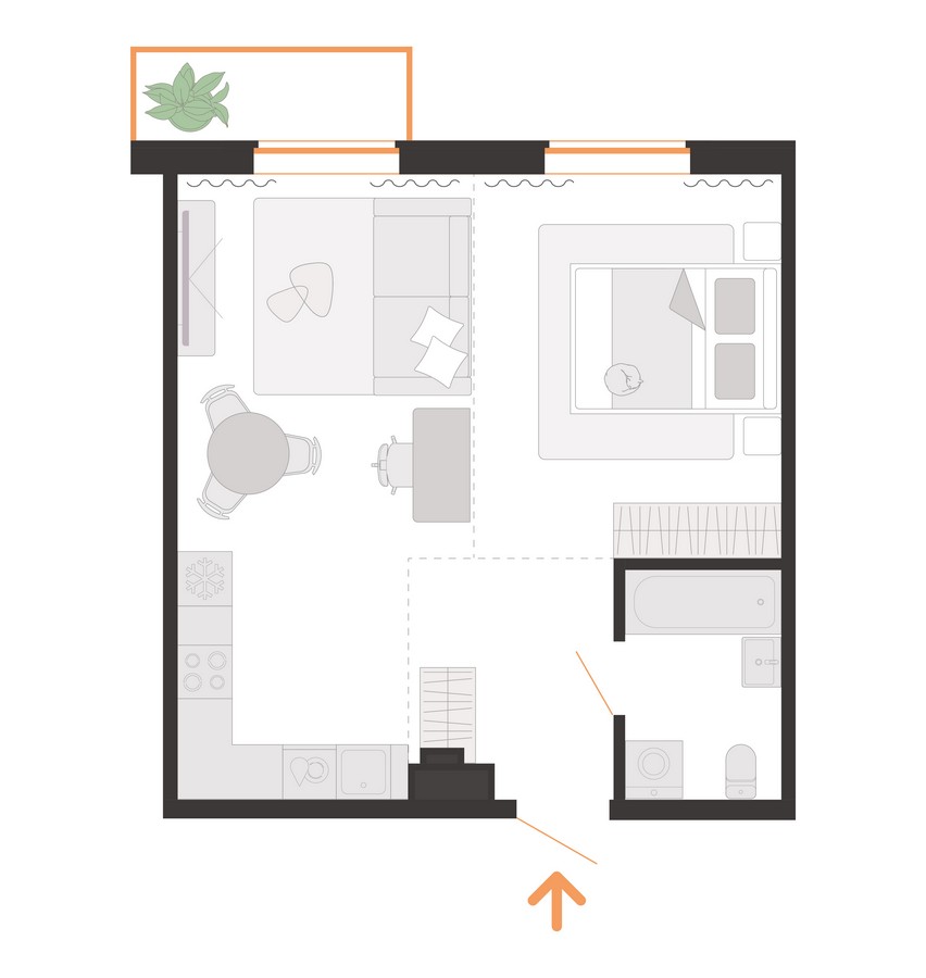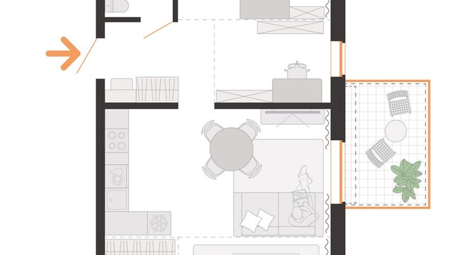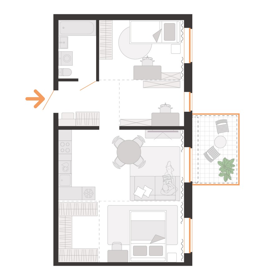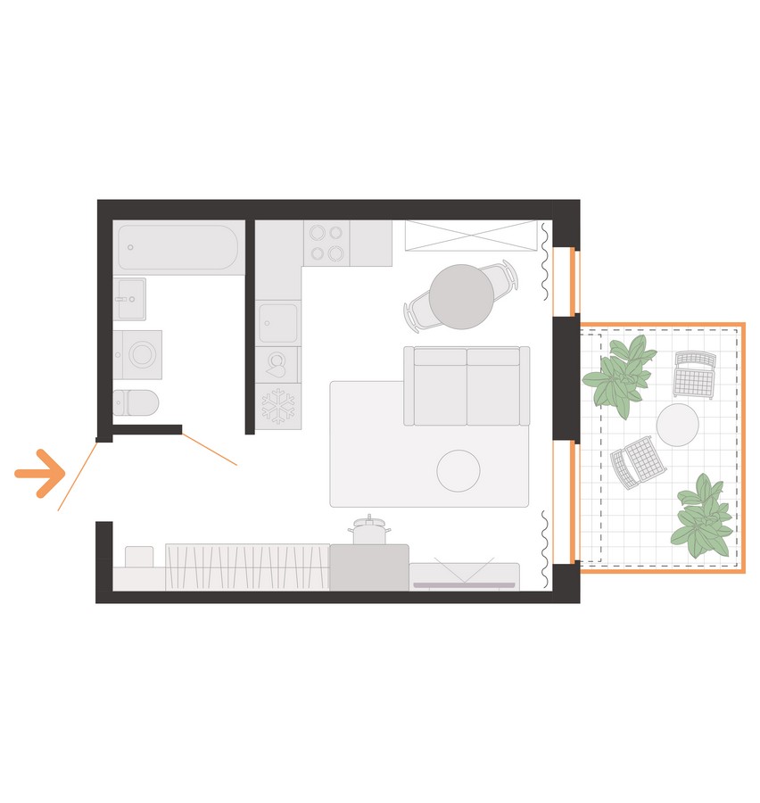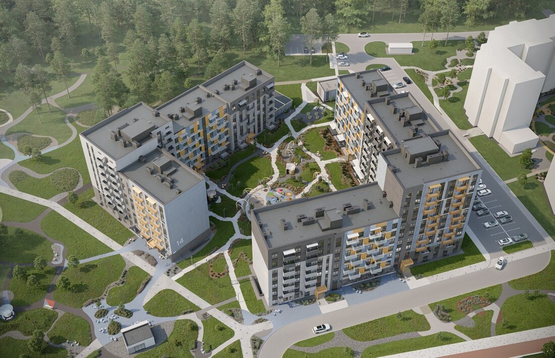 В доме будет 4 подъезда и 179 квартир. Вариативность площадей — от 20 до 79 квадратов. Квартиры могут быть с объединенным или раздельным санузлом. Предусмотрены террасы на первом этаже. В первой секции доступны квартиры с готовой отделкой и оборудованной кухней. Можно выбрать и предчистовой формат White Box.