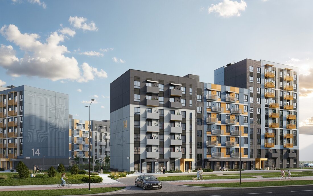 Дом под номером 14.5 по генплану разместится в центре Авиа-квартала. Он будет угловым и с переменной этажностью — от 7 до 10 этажей. Цветовое решение фасадов построено на сочетании монохромных, спокойных фоновых оттенков и ярких акцентных цветов. Основная гамма — голубой, графитовый, светло-серый — отсылает к состояниям неба. На их фоне желтые и золотистые тона будут выглядеть как свечение и отражение солнца в луне.