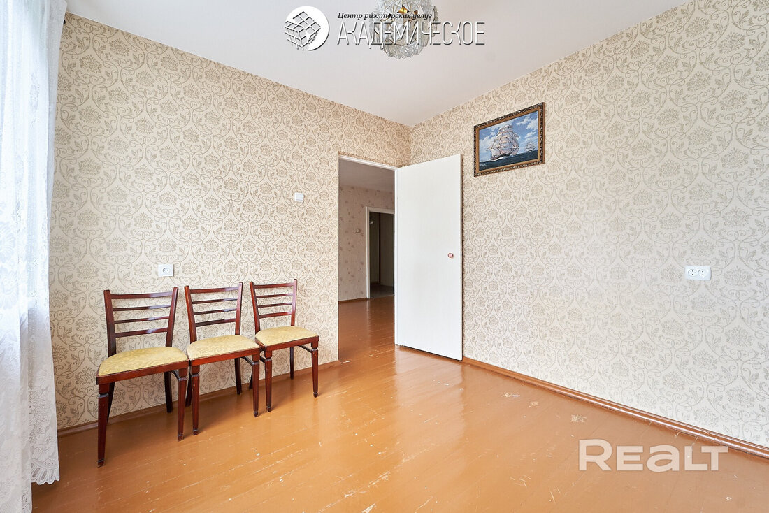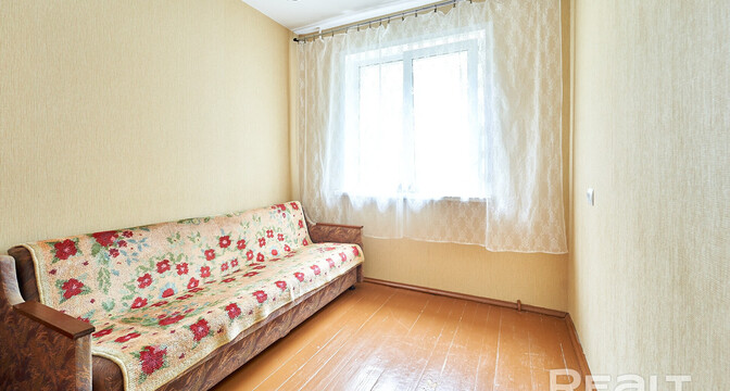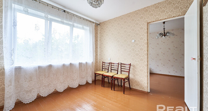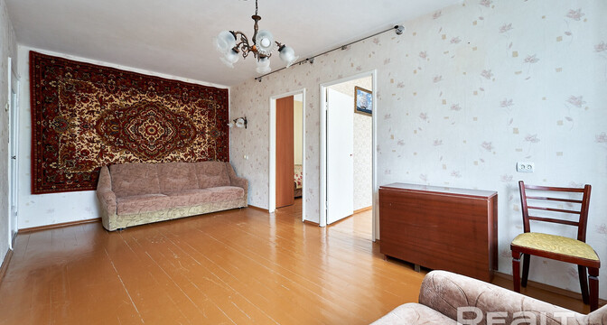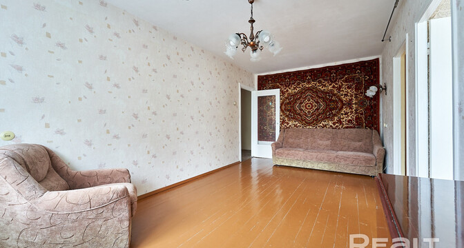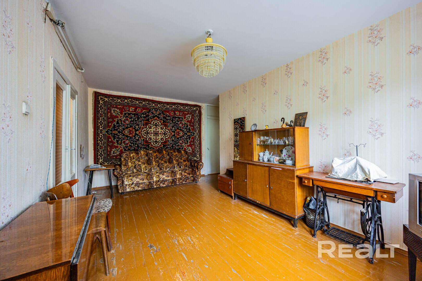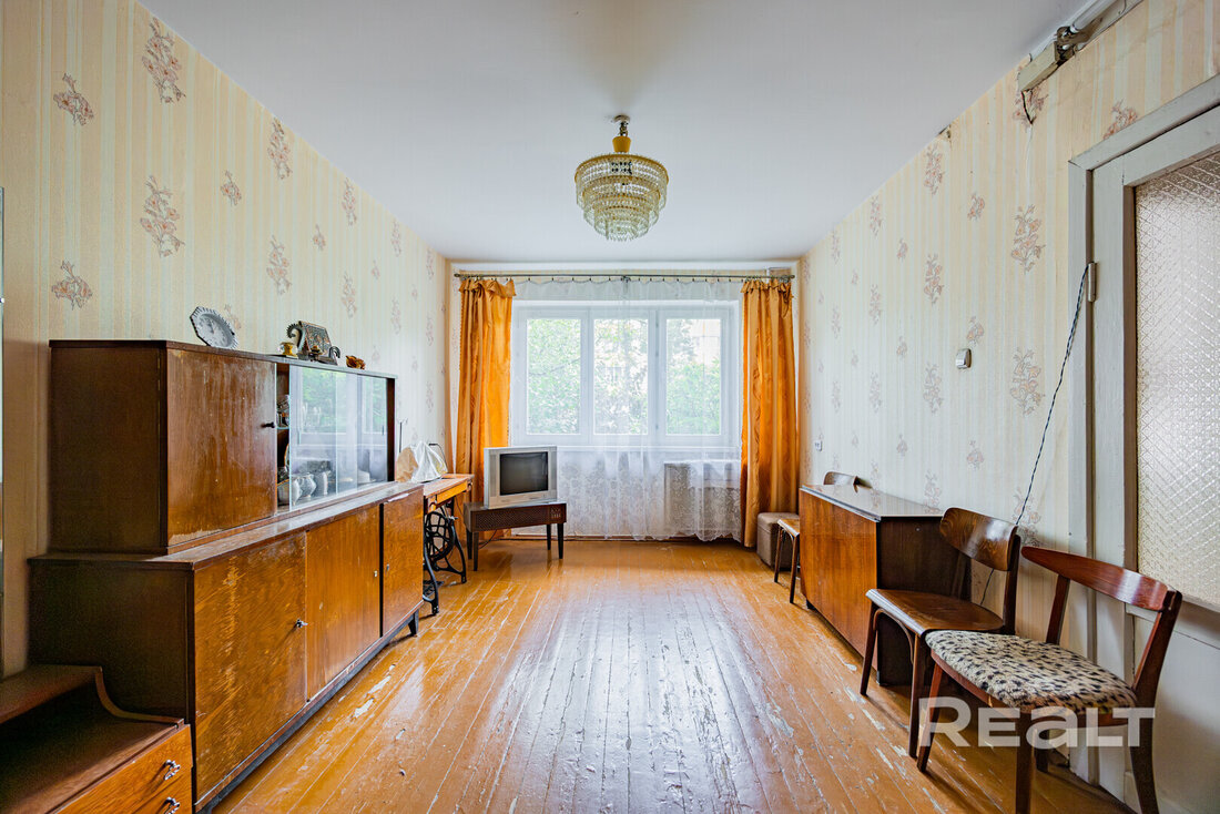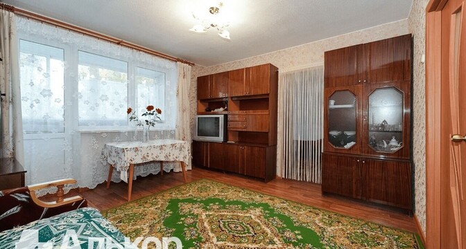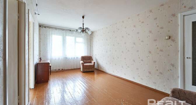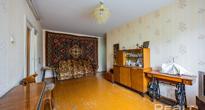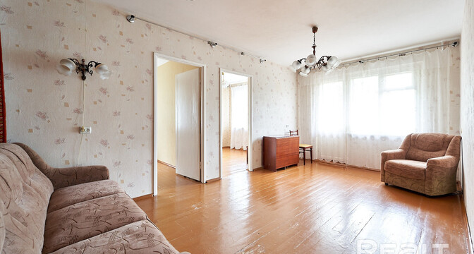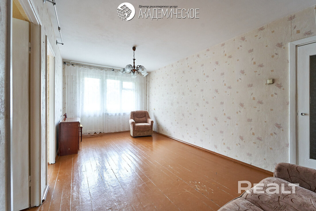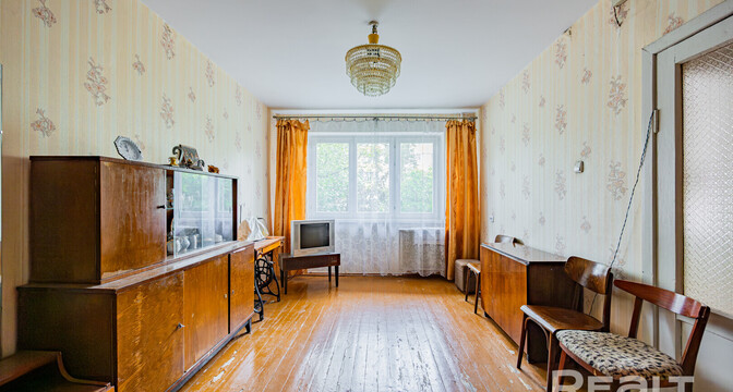 Квартира нуждается в обновлении. На полу тут лежат доски и линолеум, в окнах стоят стеклопакеты. Из гостиной можно выйти на застекленный балкон. Кстати, эта комната проходная.