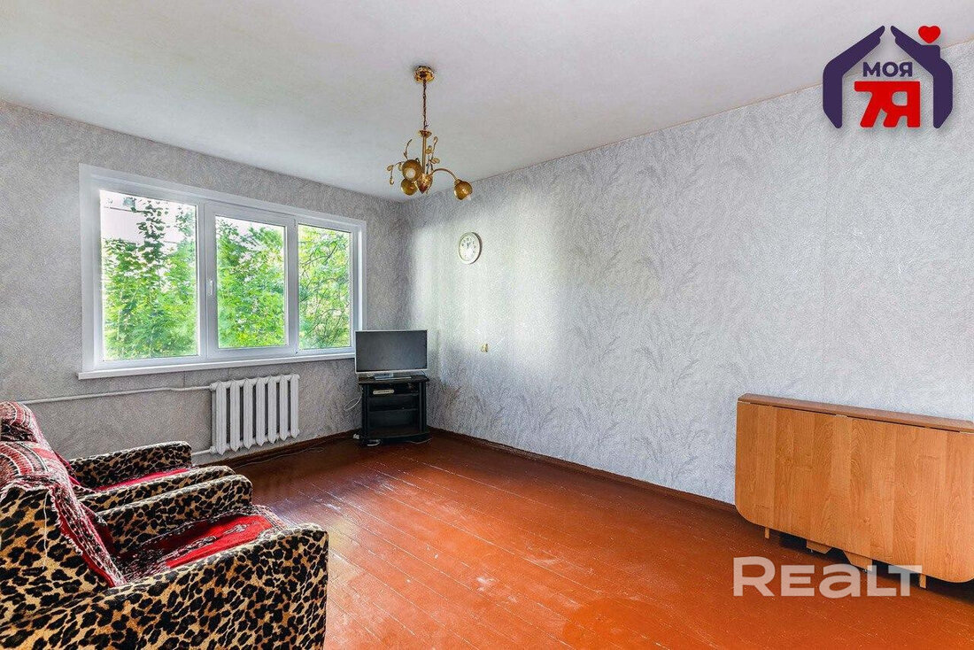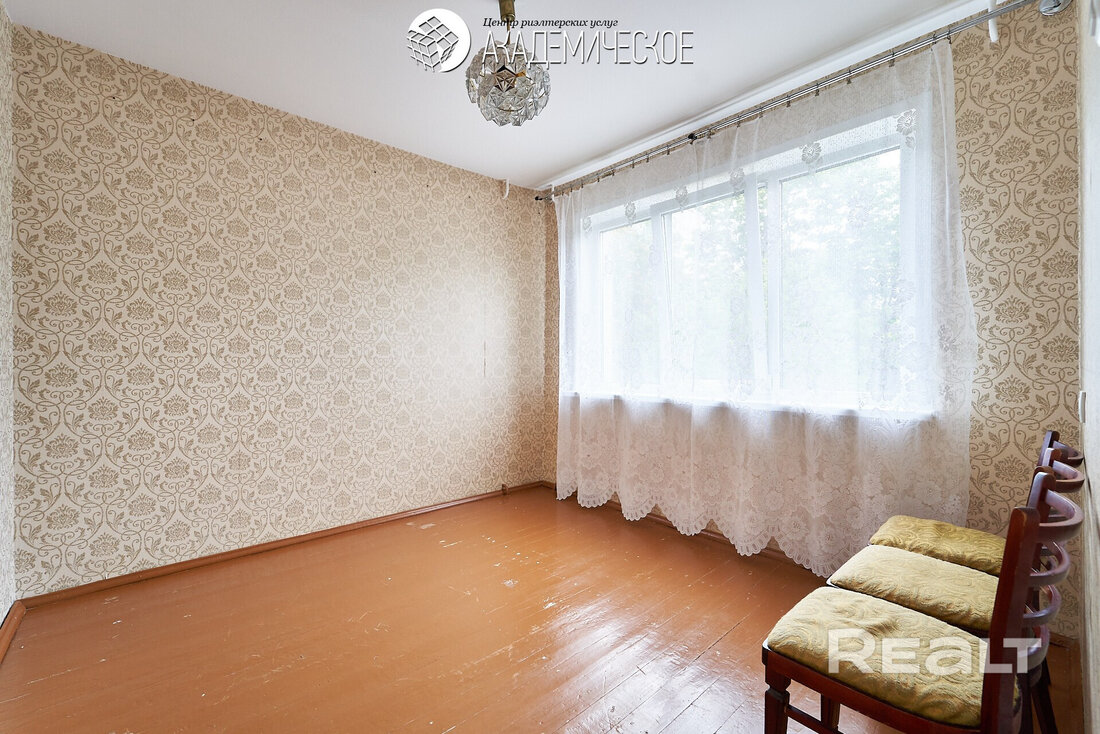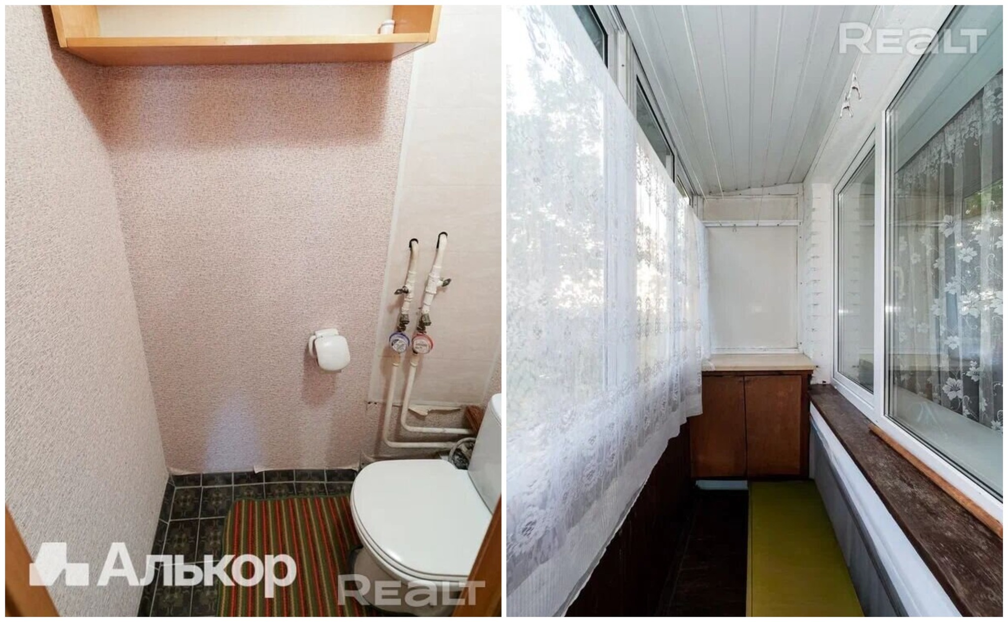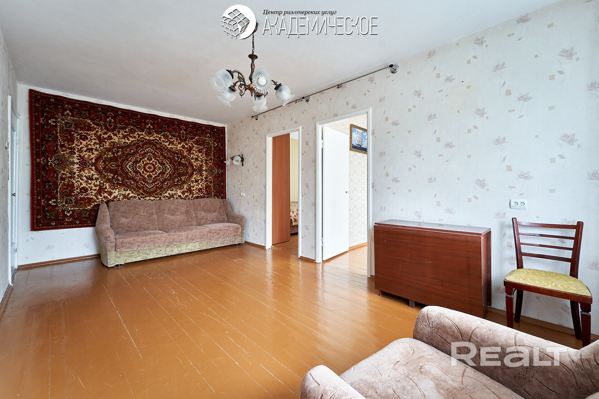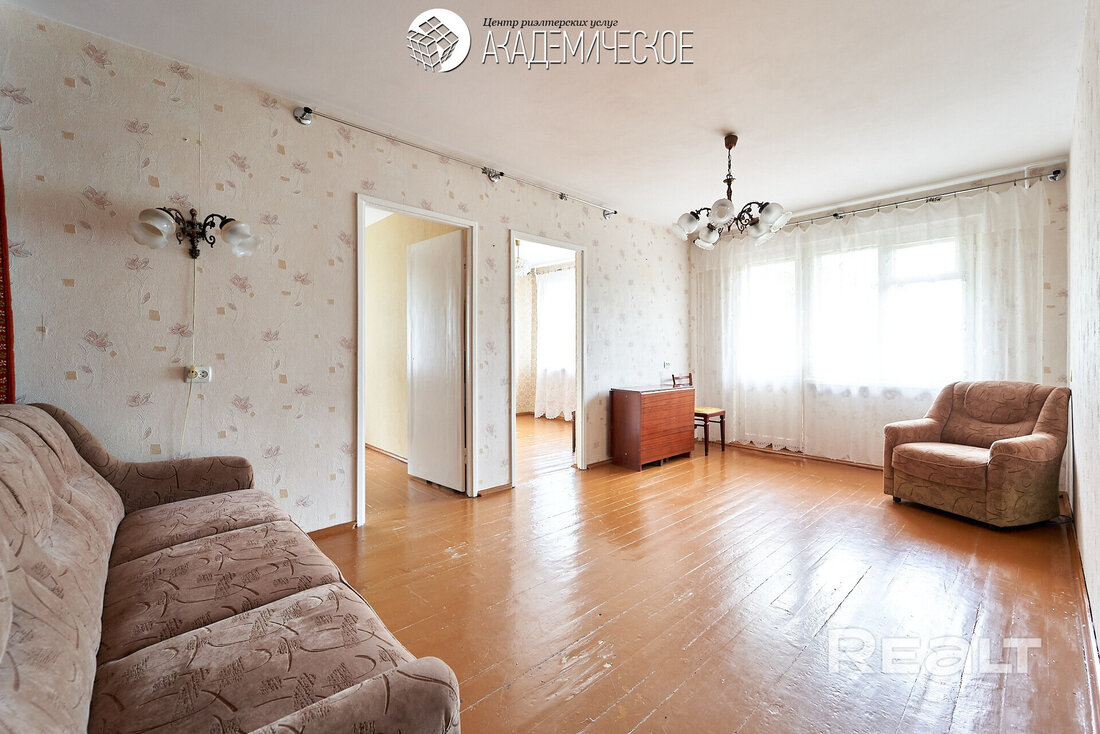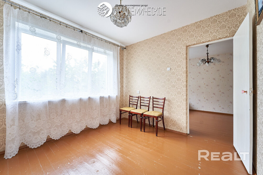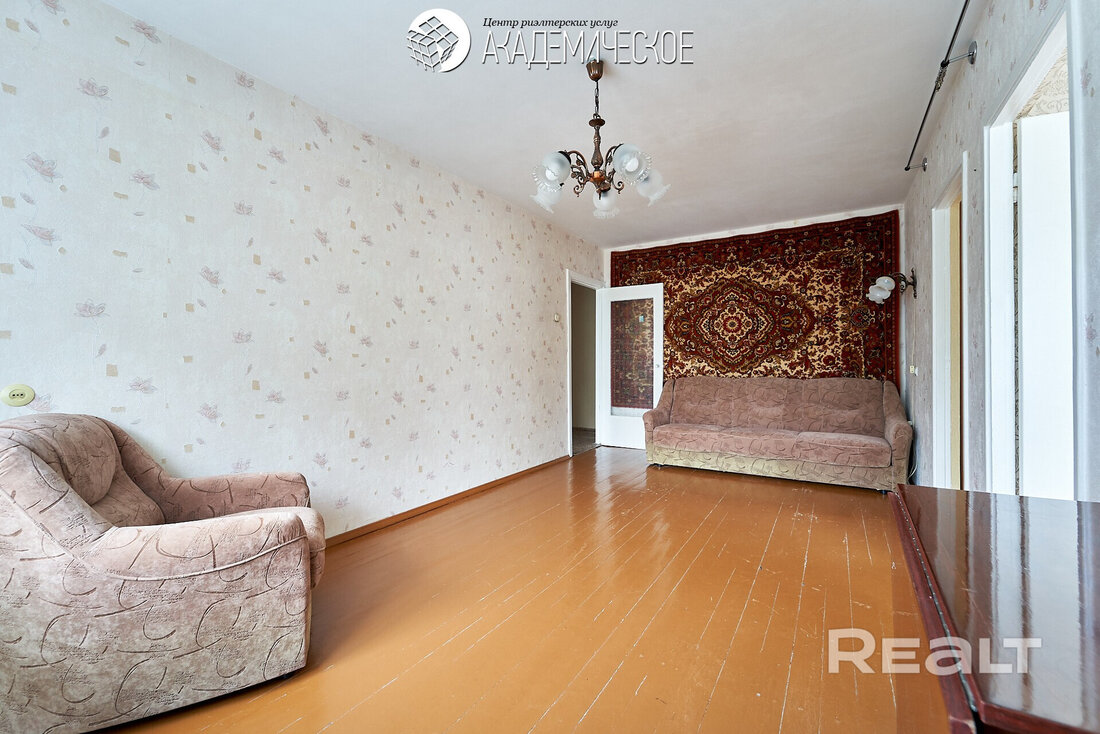 Квартира нуждается в обновлении. На полу тут лежат доски и линолеум, в окнах стоят стеклопакеты. Из гостиной можно выйти на застекленный балкон. Кстати, эта комната проходная.