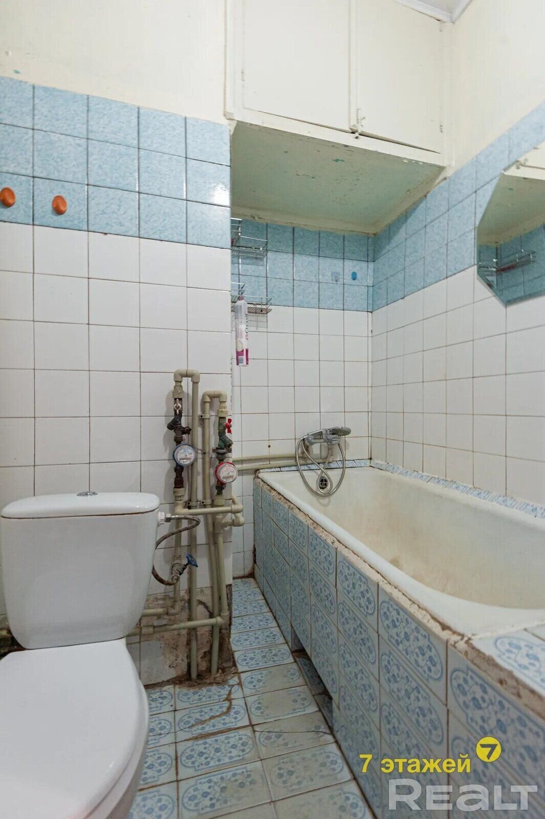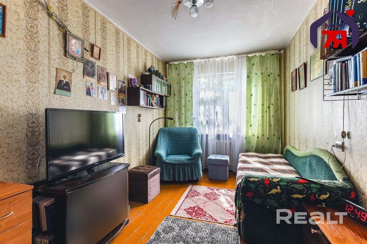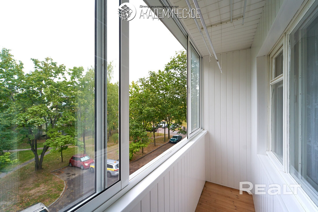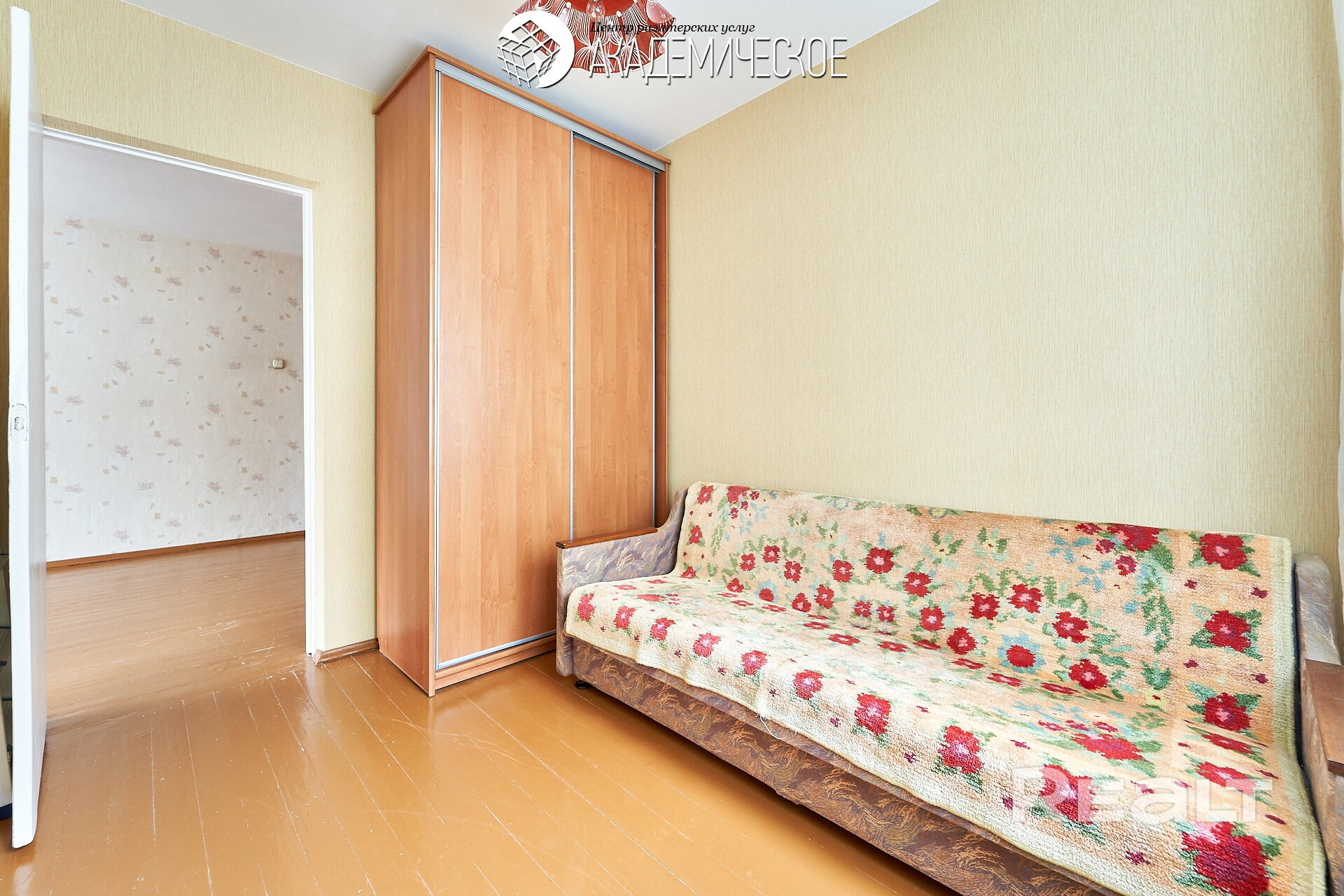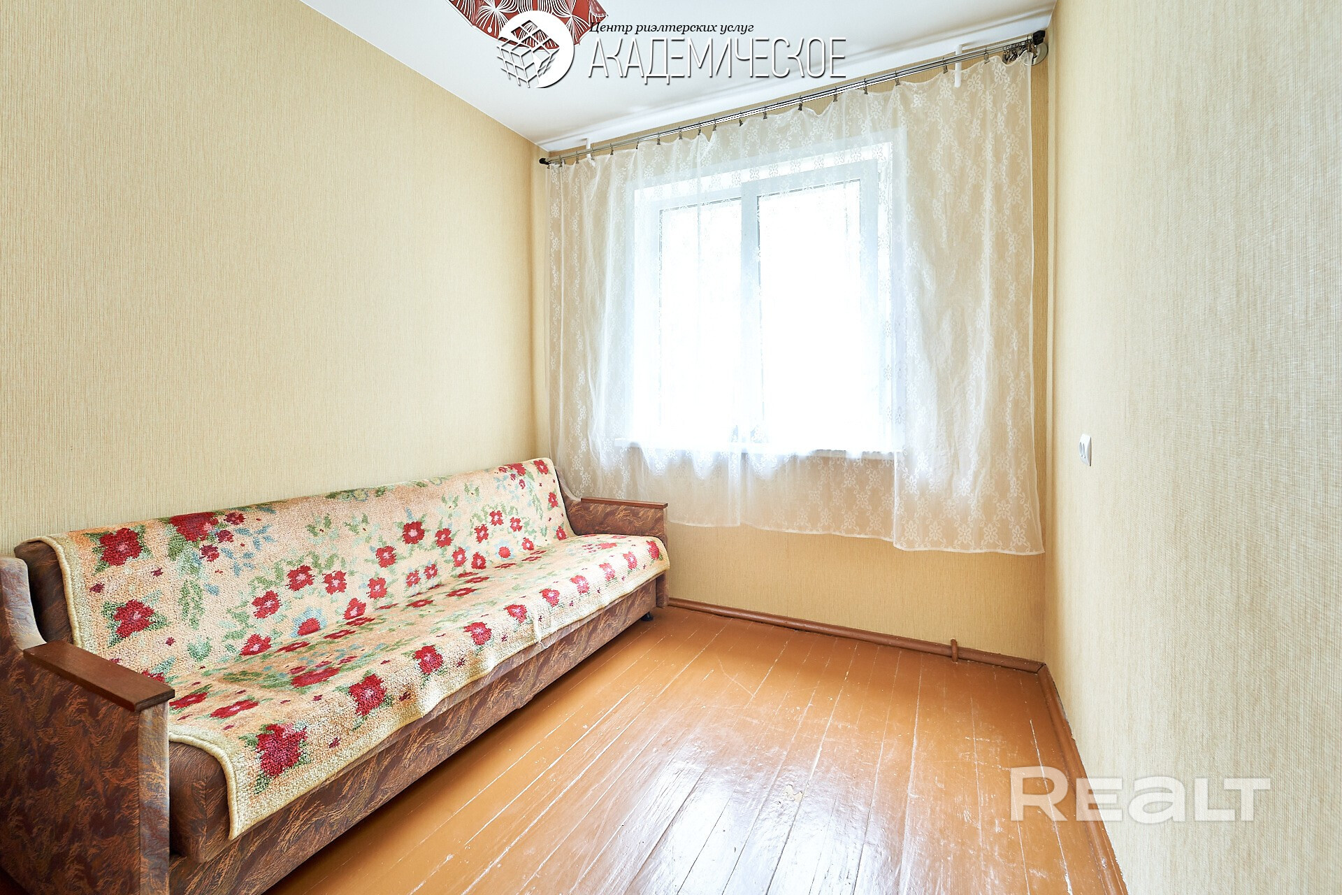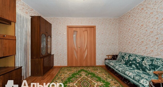 Квартира нуждается в обновлении. На полу тут лежат доски и линолеум, в окнах стоят стеклопакеты. Из гостиной можно выйти на застекленный балкон. Кстати, эта комната проходная.