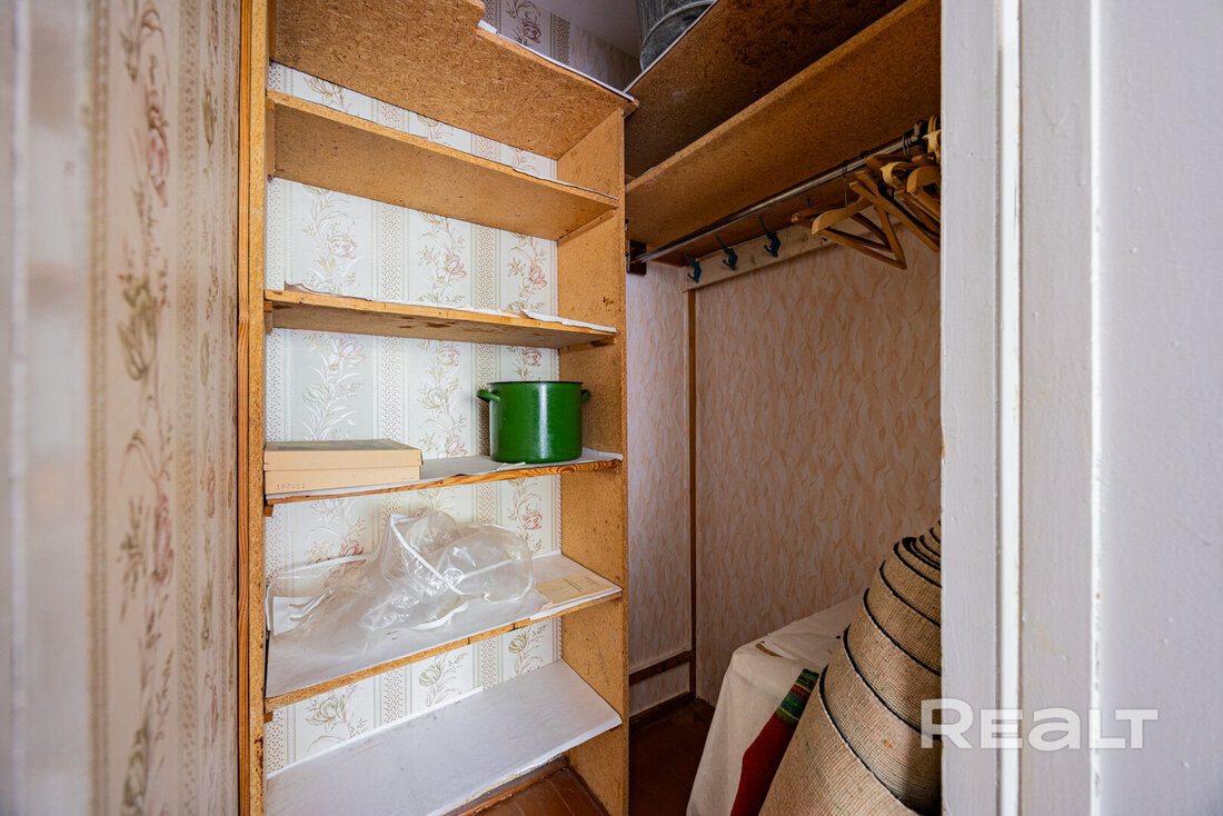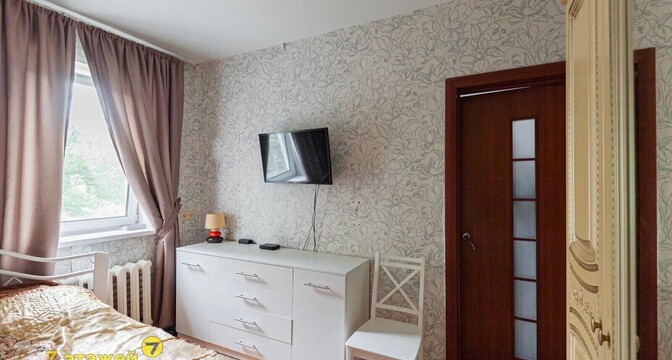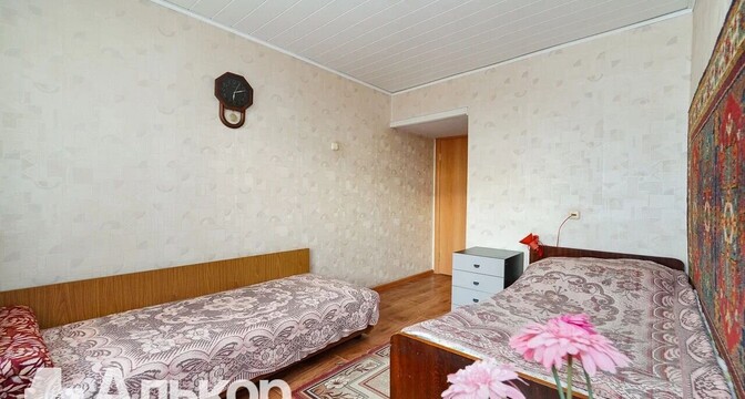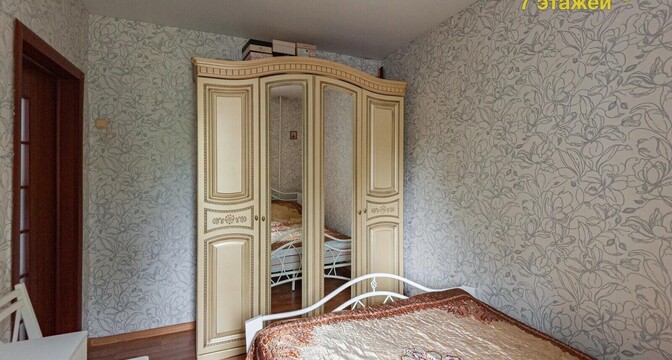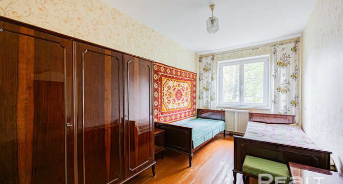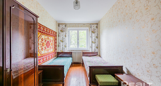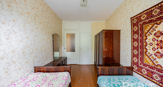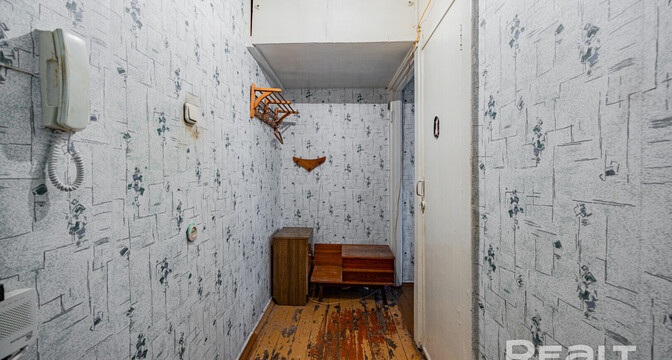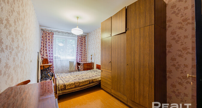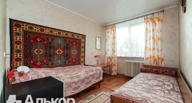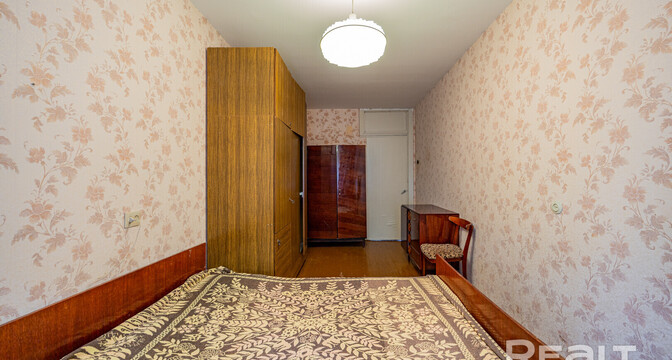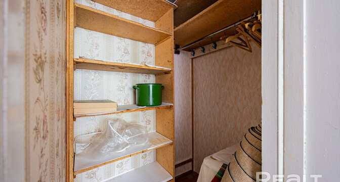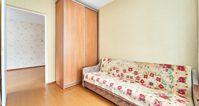 Это жилье также нуждается в обновлении. Из гостиной есть выход в небольшой коридор, где расположились две спальни и кладовая. Балкона тут нет. Полы — деревянные. В окнах, что выходят на две стороны, стоят стеклопакеты.