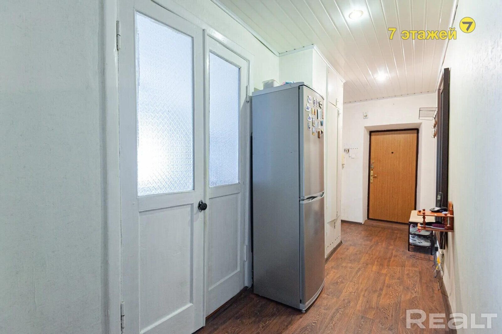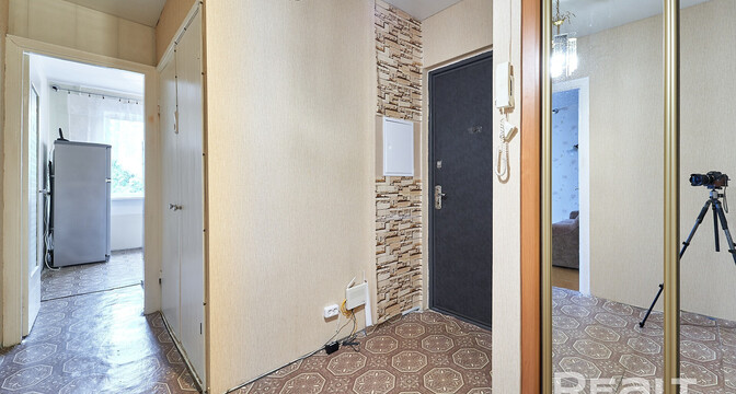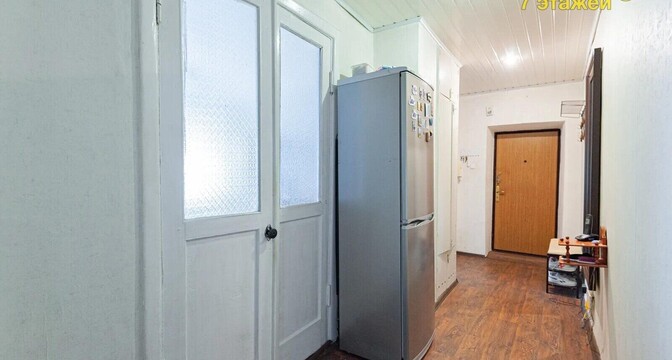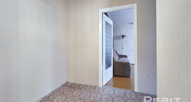 В квартире одна из комнат — проходная. По планировке в коридоре имеются две ниши под шкафы. На полу лежит линолеум, в окнах установлены стеклопакеты.