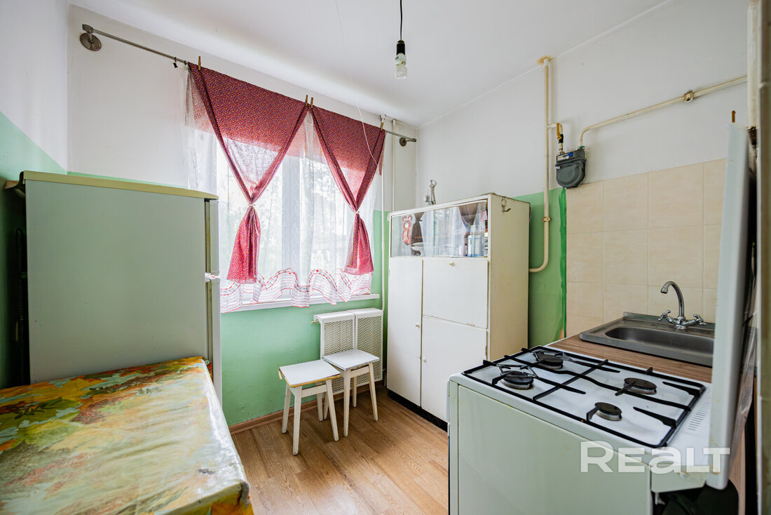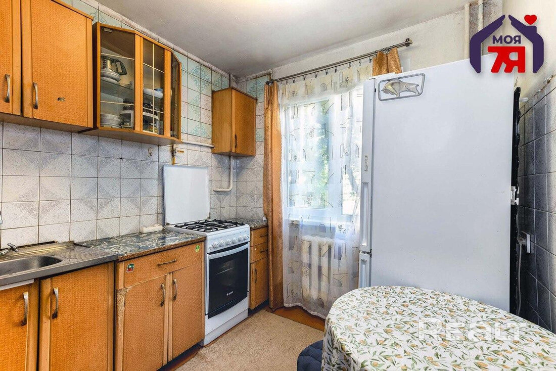 Эта квартира находится в трехэтажной сталинке 1950 года постройки на Строителей, 2. Трешка разместилась на втором этаже и занимает 52 м². Площадь кухни — 4,8 метра.