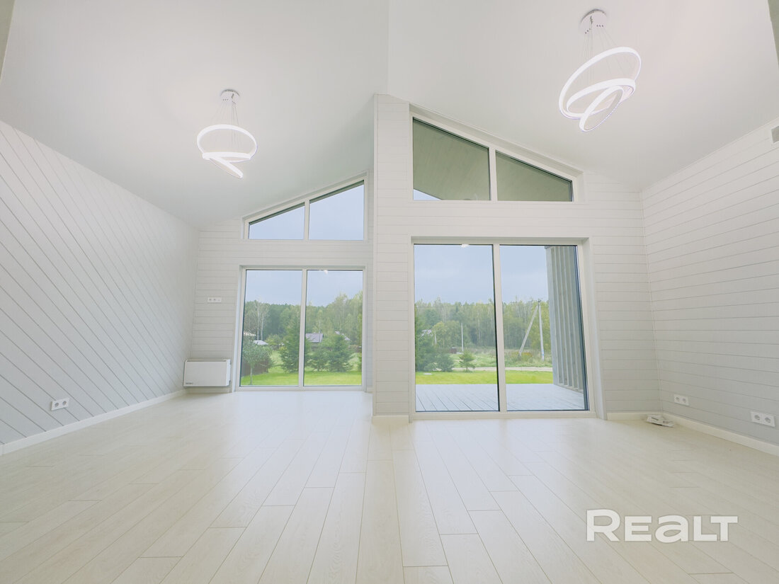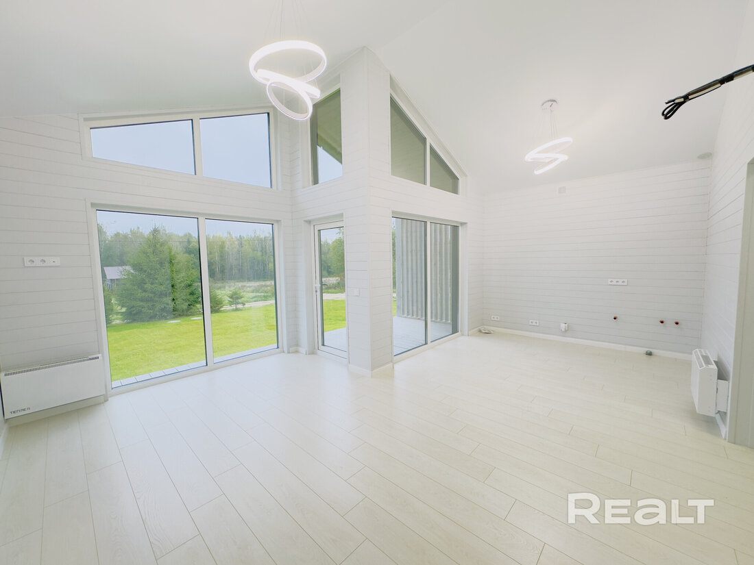 Дача отделана внутри и снаружи. Комнаты просторные за счет больших окон и высоких потолков, которые достигают 4 метров. Помогает и светлый интерьер.
