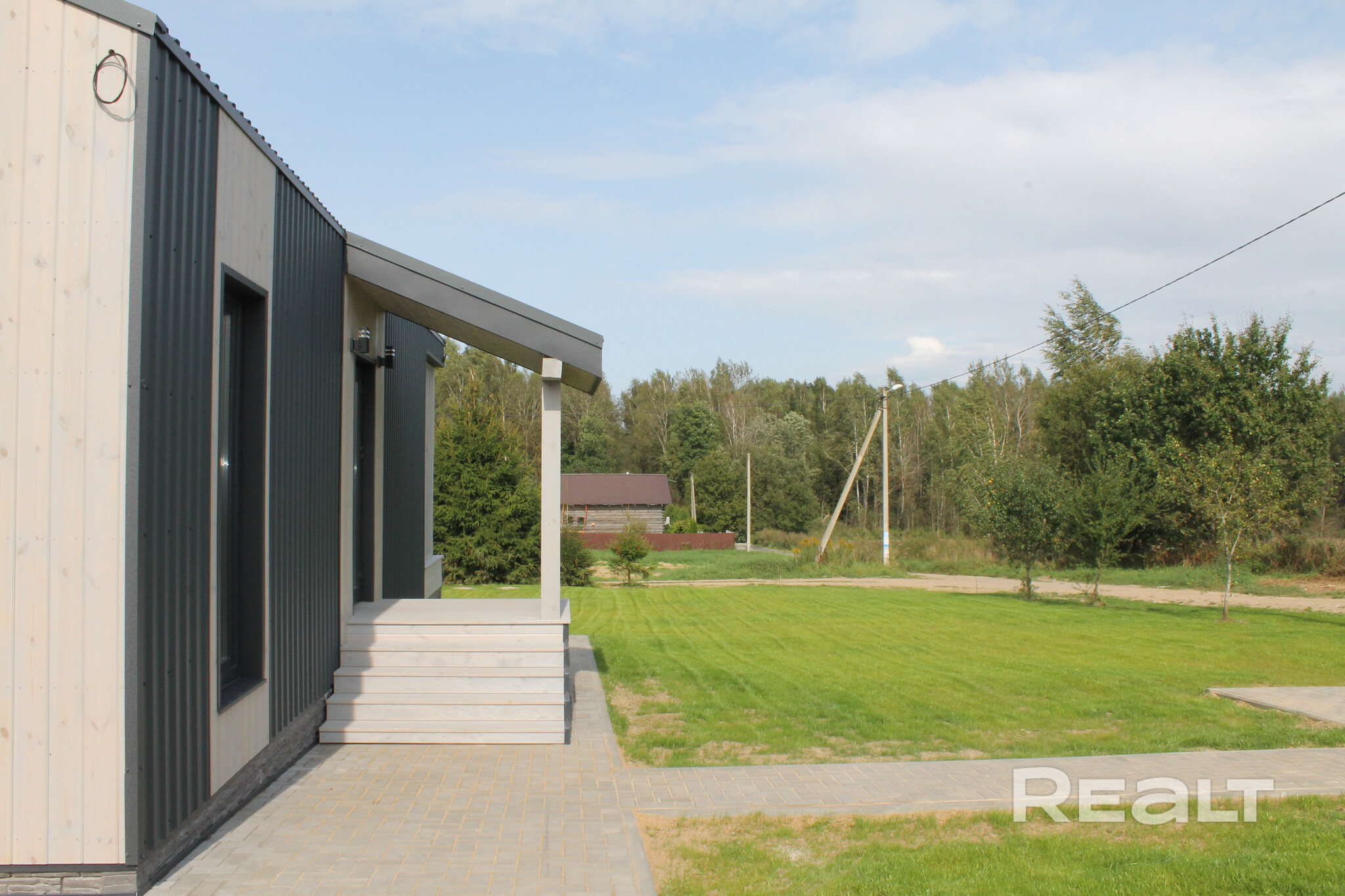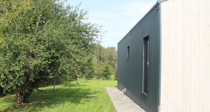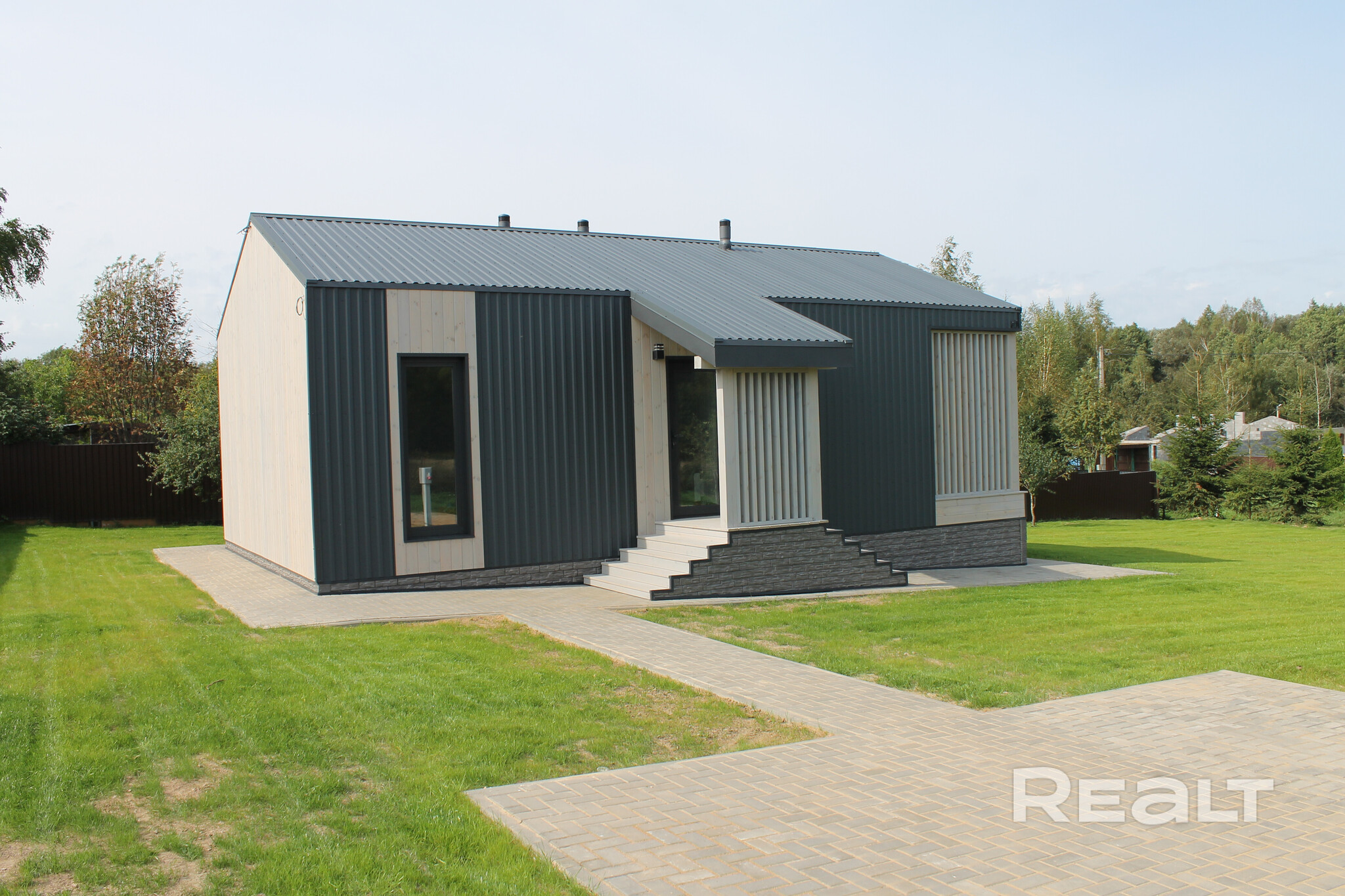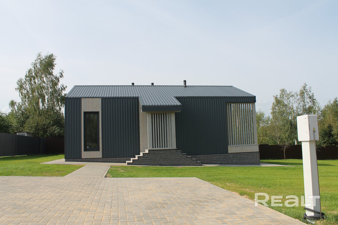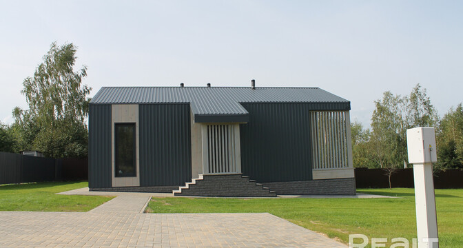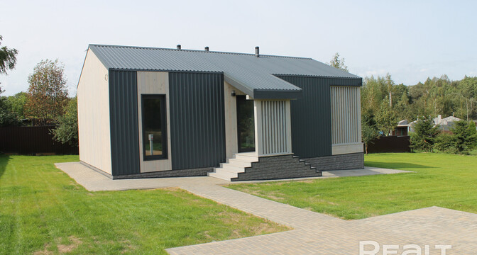 Современный каркасный дом построили в этом году в СТ «Нарейки». Дом — одноэтажный, в 78 квадратных метров. На крыше лежит металл.