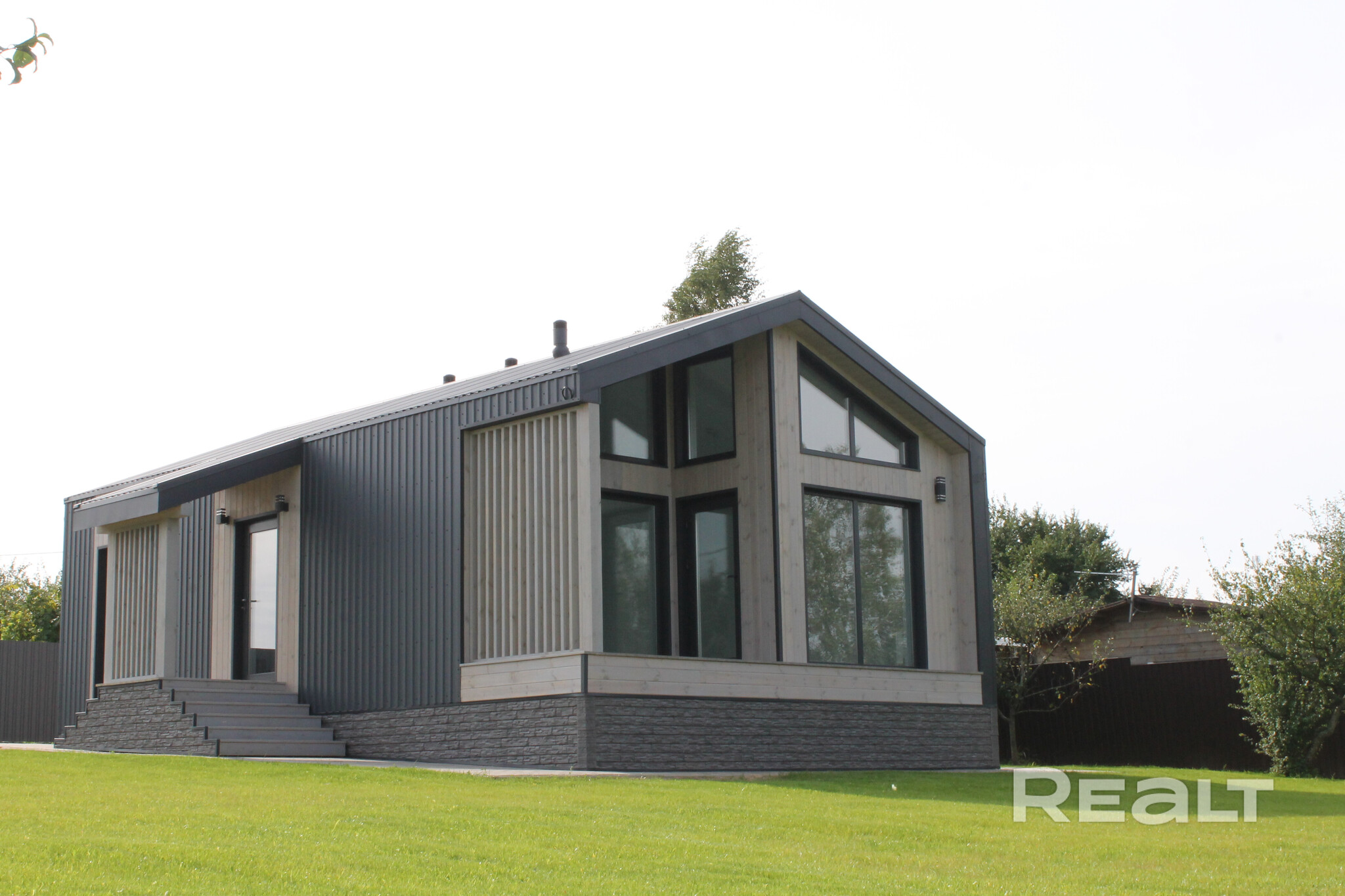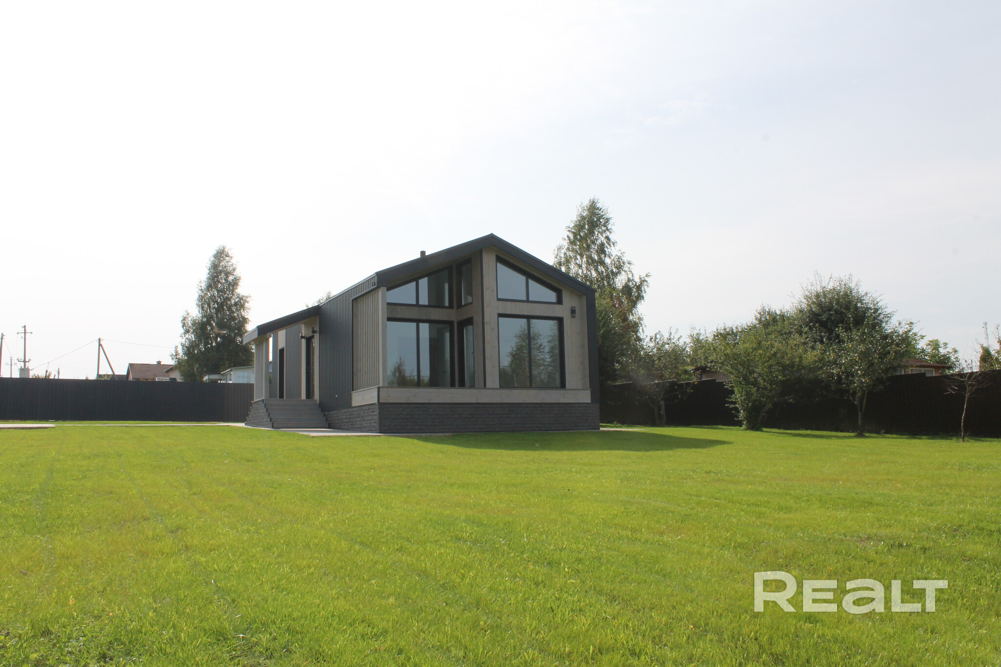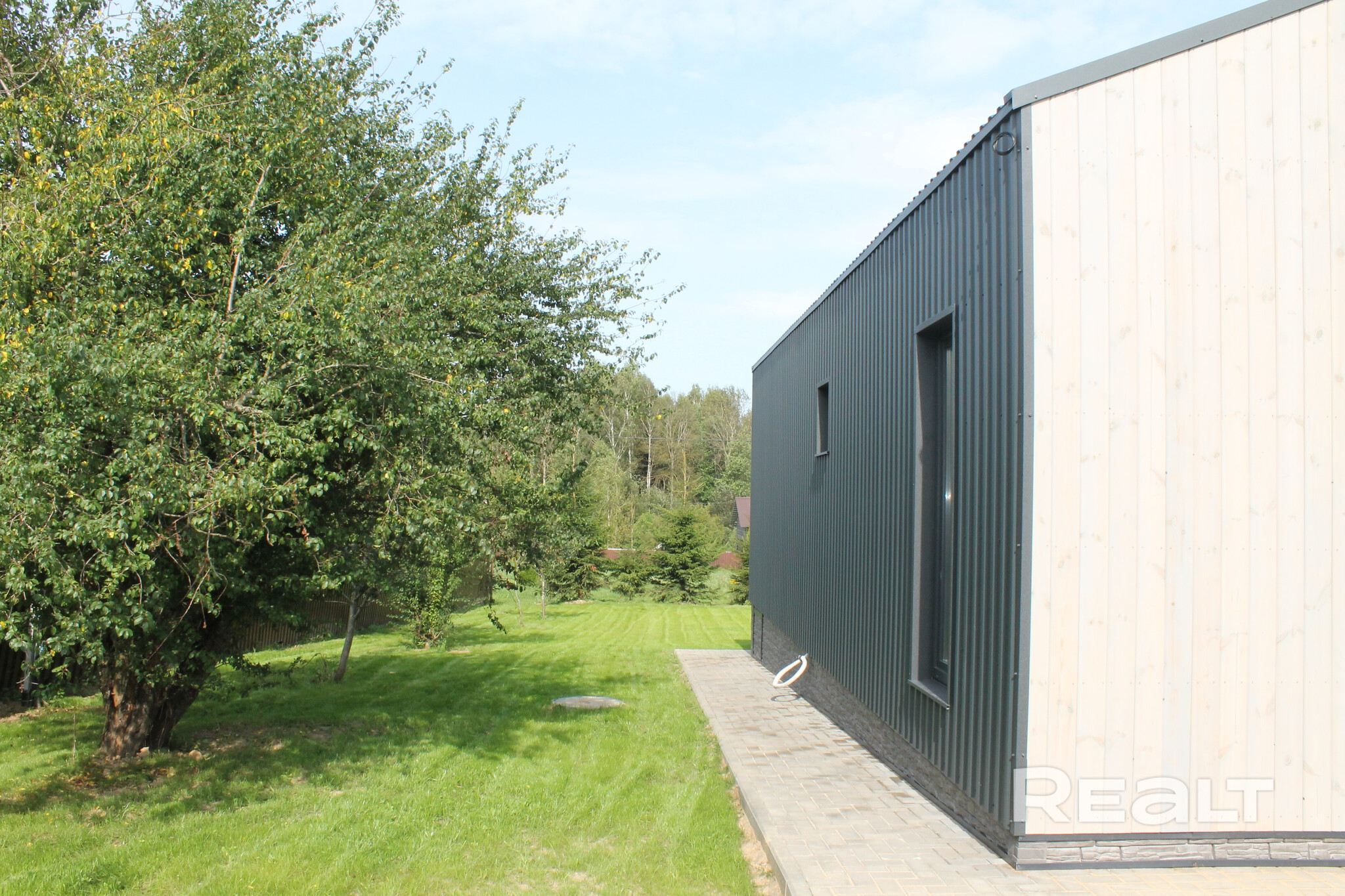 Современный каркасный дом построили в этом году в СТ «Нарейки». Дом — одноэтажный, в 78 квадратных метров. На крыше лежит металл.