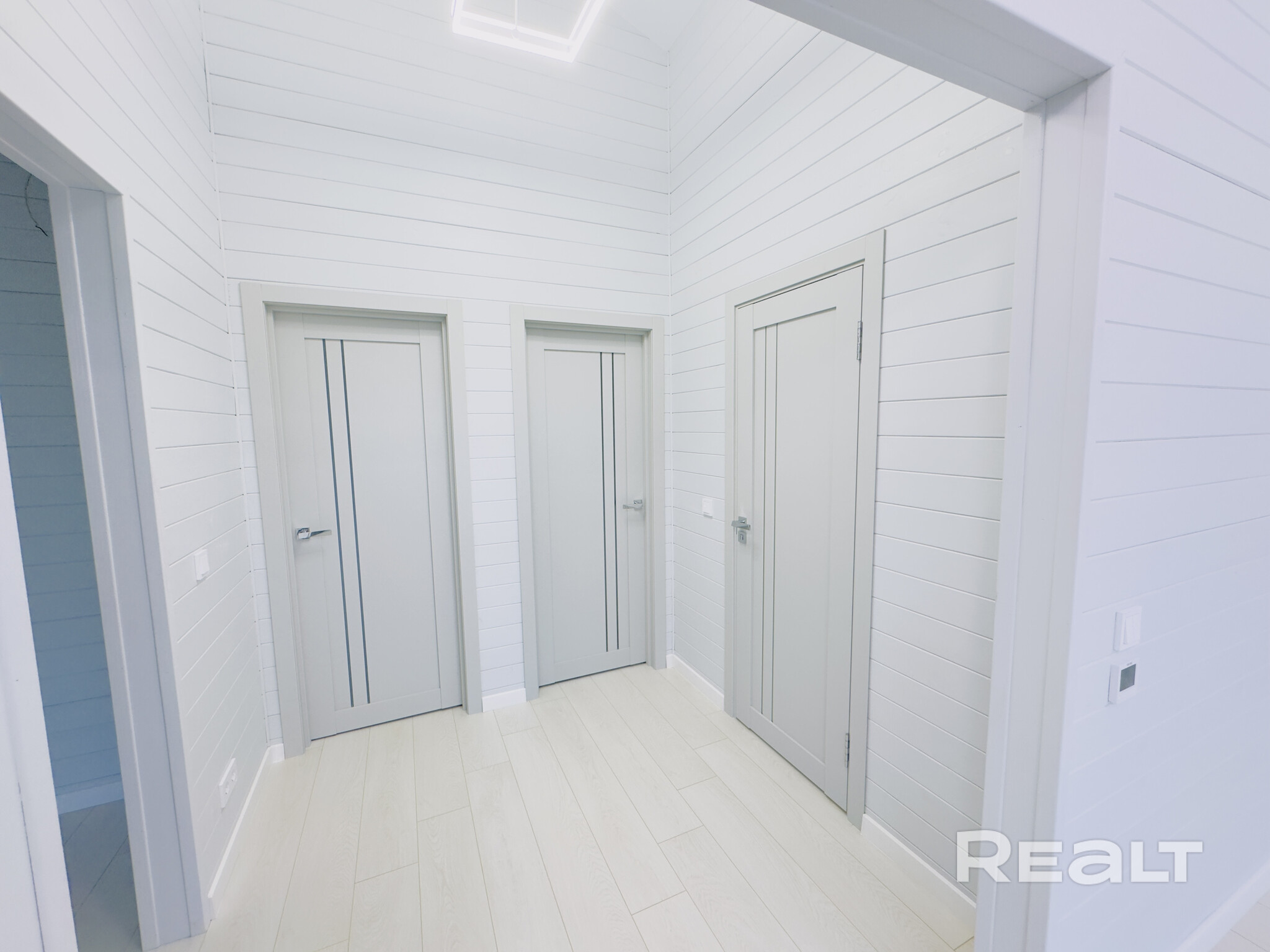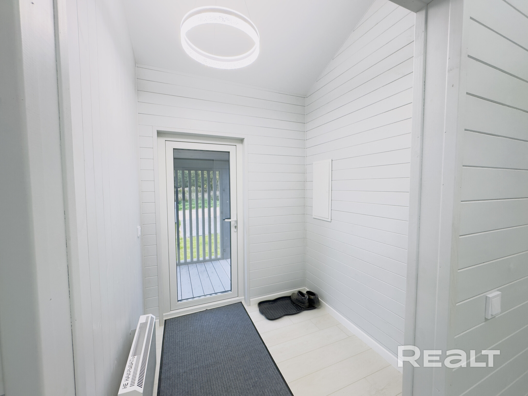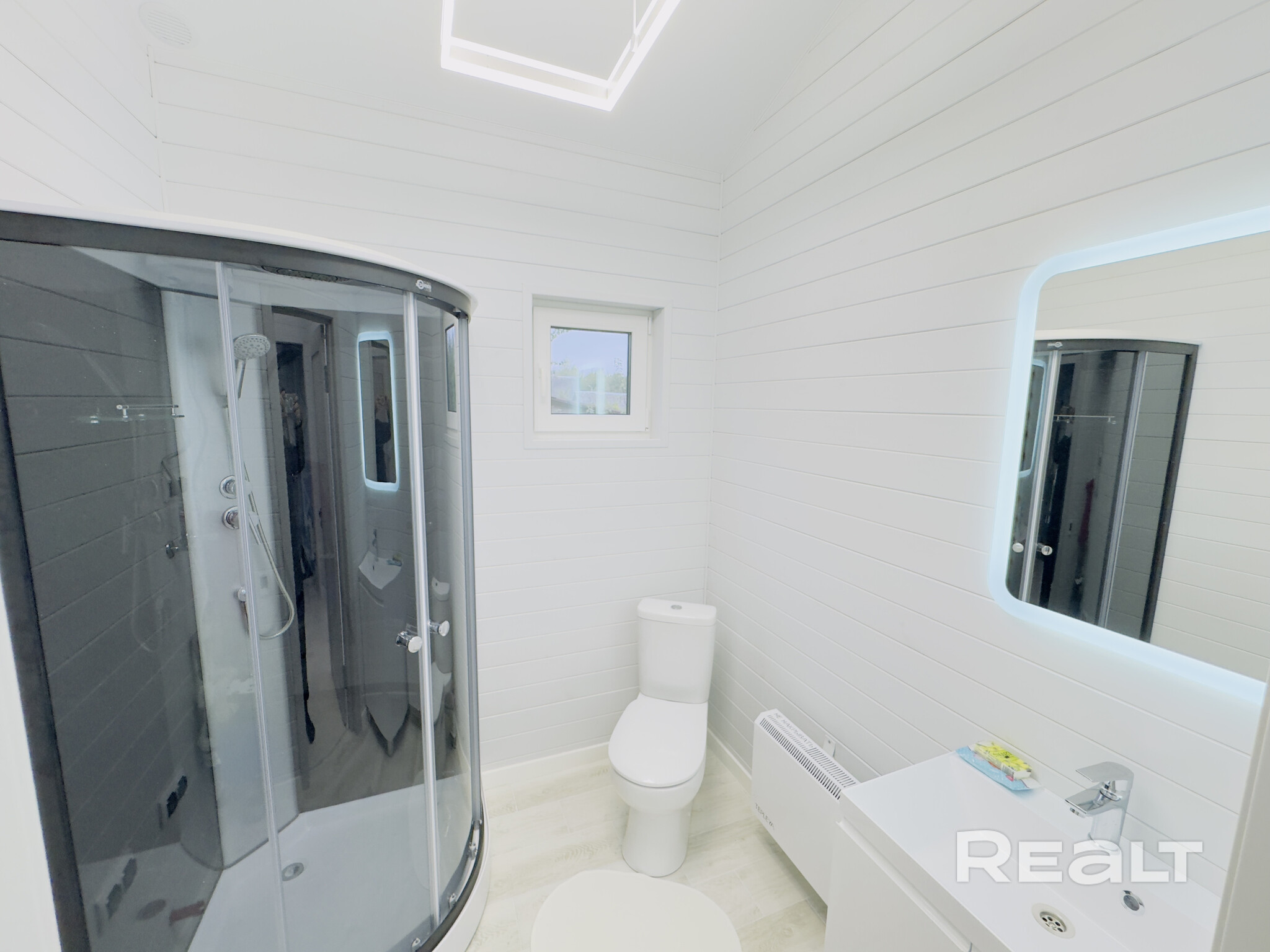 Входная группа находится с другой стороны. Напротив него расположился санузел с душевой кабиной и бойлером. Вода поступает из скважины, канализация — местная. Предусмотрено электрическое отопление. Имеются коммуникации для системы «умный дом».