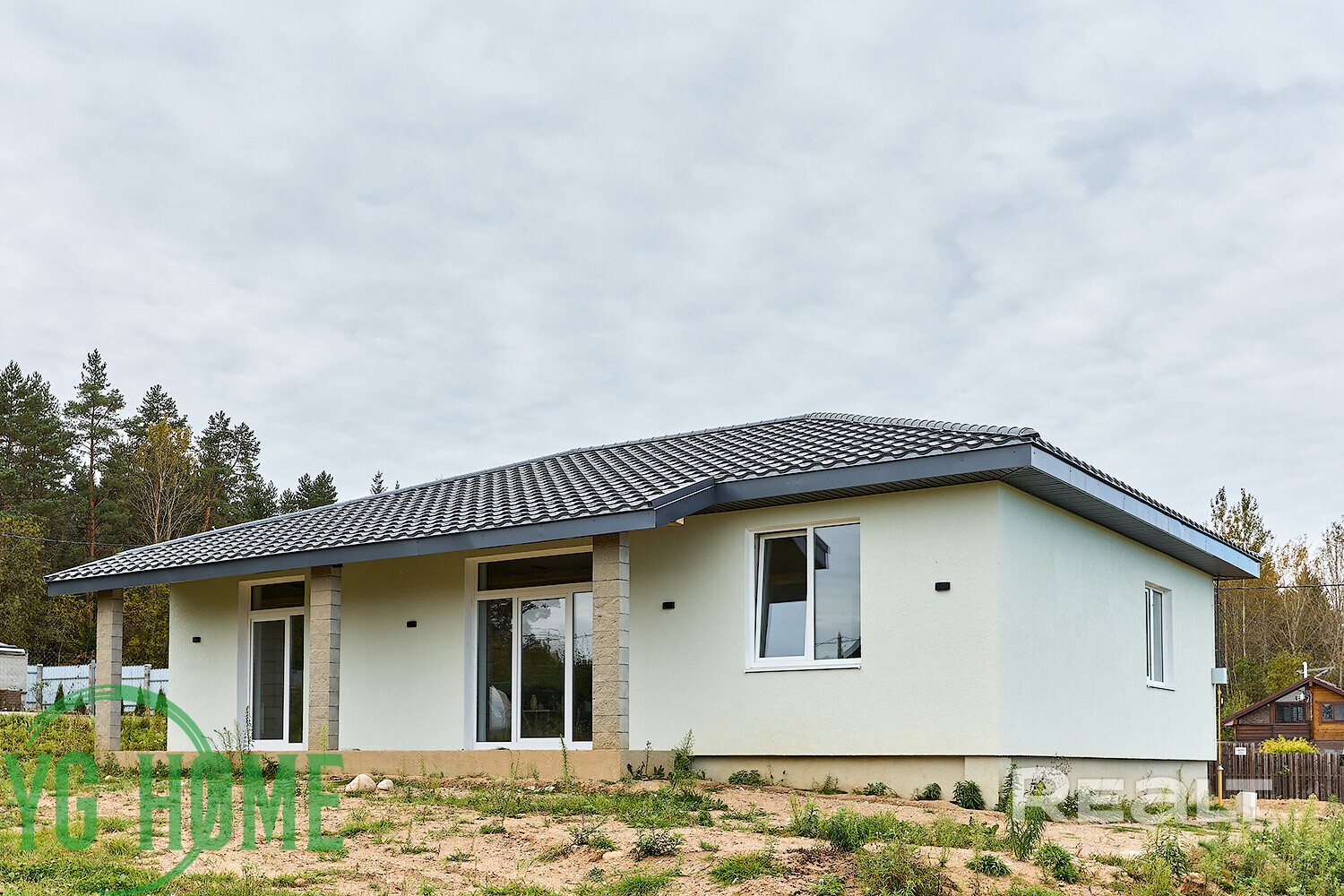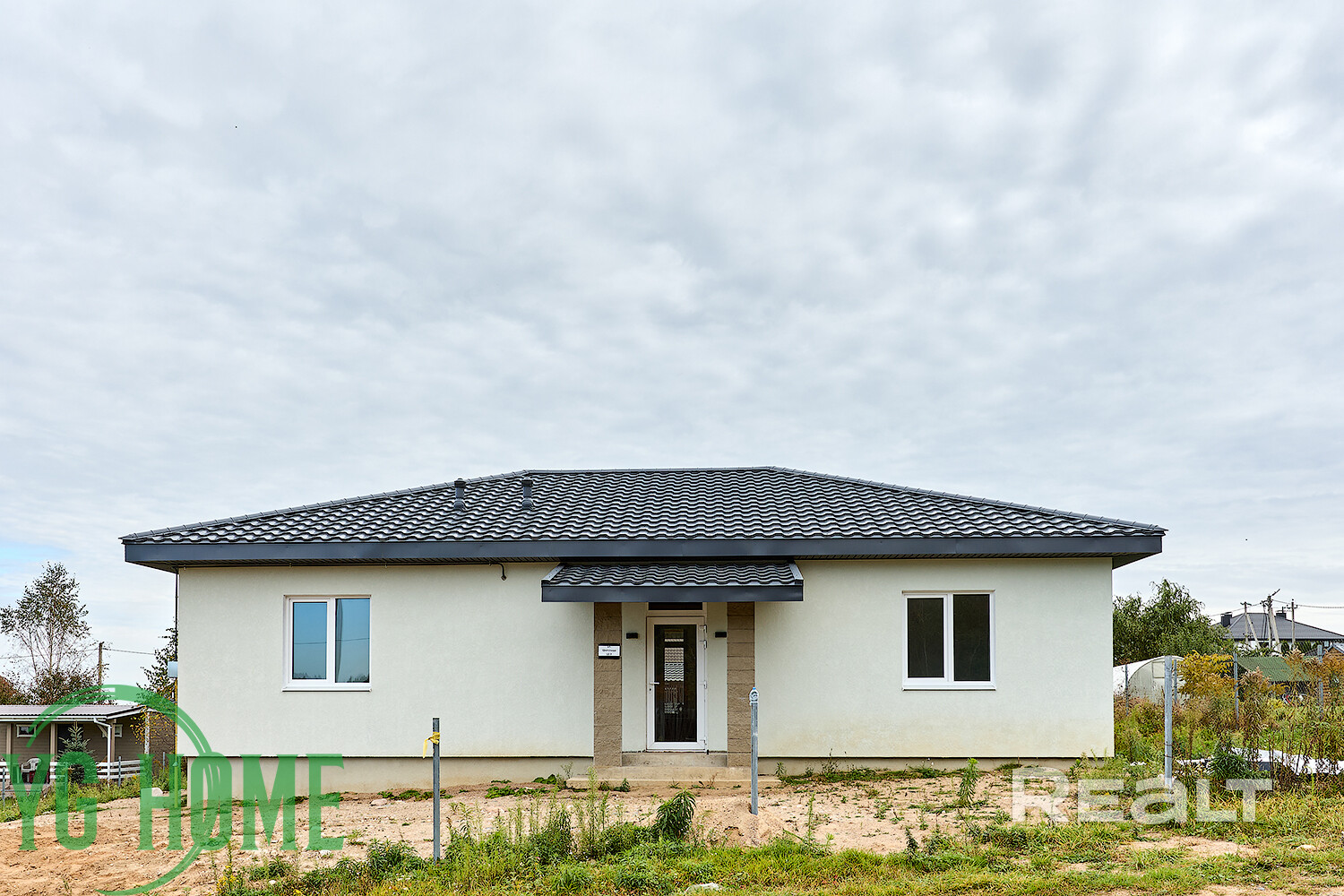 Сейчас тут продается одноэтажная дача. Она — совсем новая, была построена в этом году. Дом стоит на монолитно-ленточном фундаменте, возведен из газосиликатных блоков, оштукатурен и покрыт металлочерепицей.