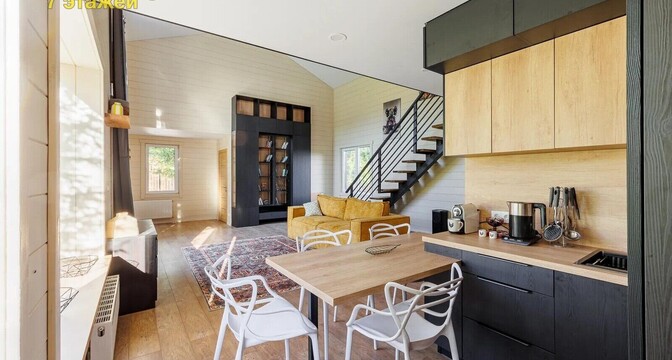 На первом этаже разместилась совмещенная кухня-гостиная. Она уже обставлена мебелью и бытовой техникой.