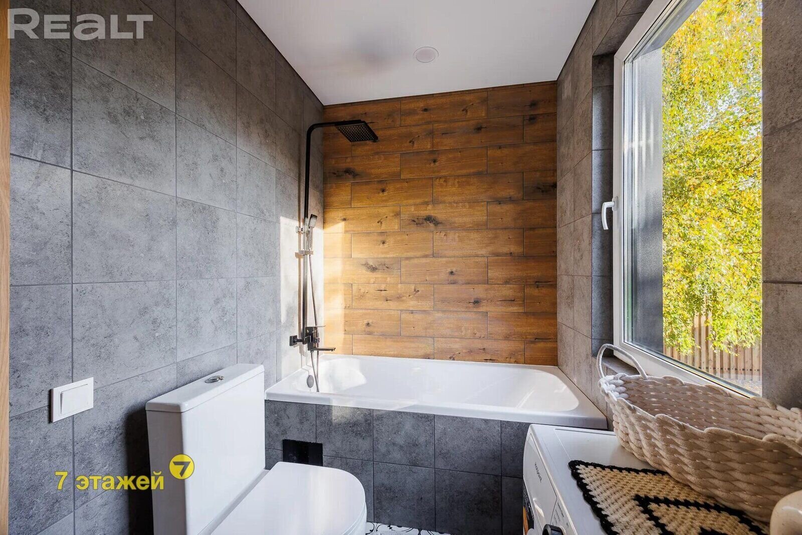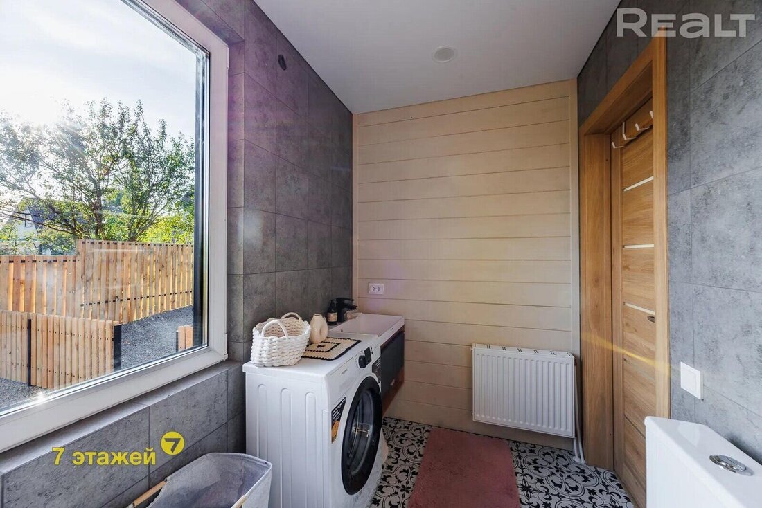 В совмещенном санузле также стоит большое окно. Здесь уместилась и стиральная машина. Выделена котельная комната. Отапливается дом с помощью электричества (в помещениях можно заметить радиаторы). Канализация — местная, а вода введена из скважины. Автор объявления указал, что газовая труба лежит неподалеку.