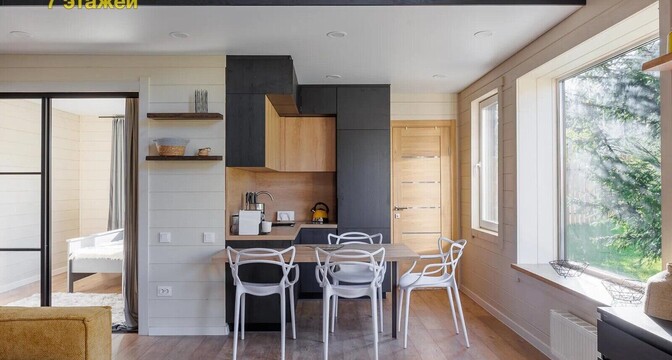 Рядом с зоной готовки обустроили и изолированную спальню. Еще две находятся на мансардном уровне.
