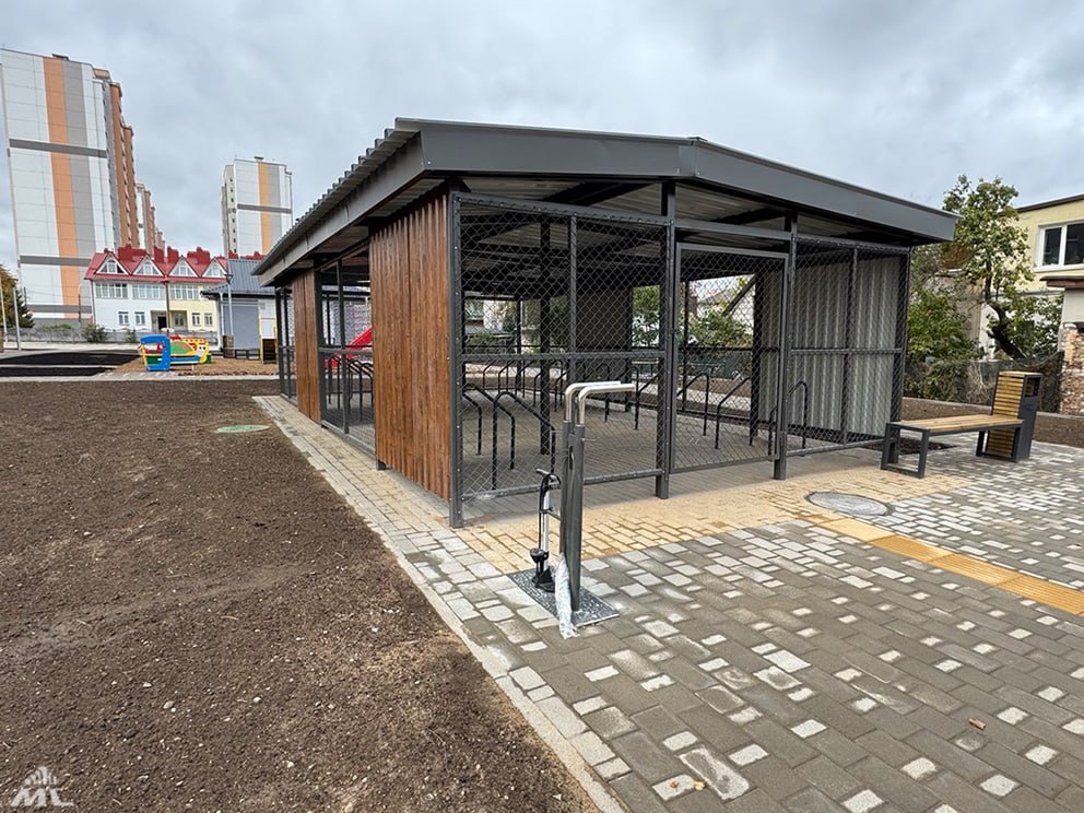 Параллельно ведется благоустройство дворов. Здесь уже есть детские площадки, уличные тренажеры, зоны для тихого отдыха. Можно заметить и станцию для ремонта и обслуживания велосипедов с возможностью подкачки колес и проверки давления в камерах. Такое застройщик устанавливает впервые. Строители еще дорабатывают и плоскостную стоянку.