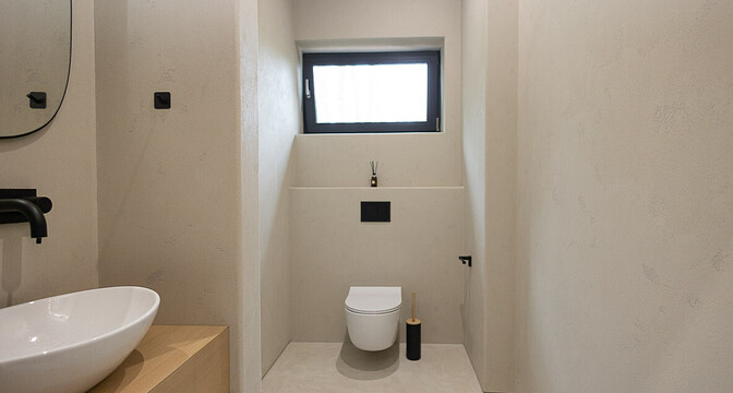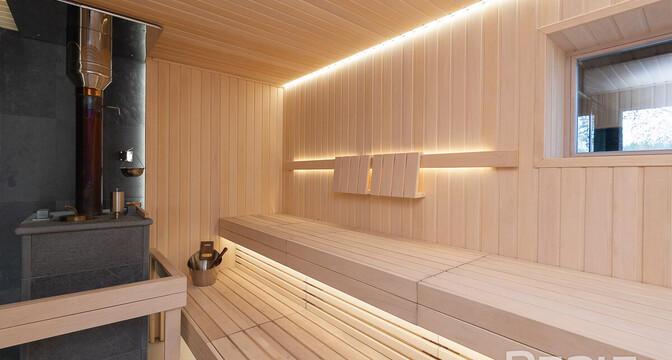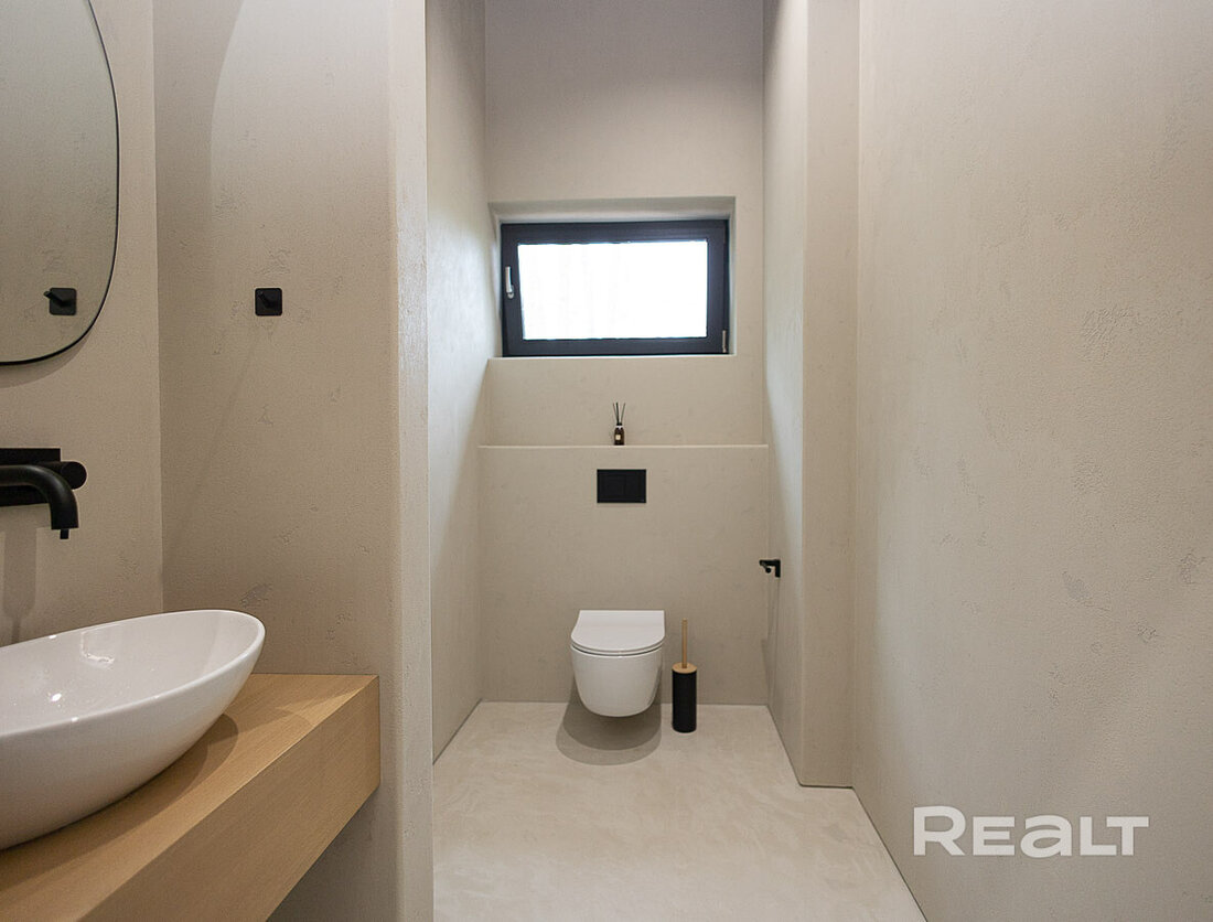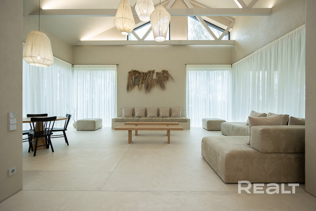 Внутри сделан дизайнерский ремонт. Самая большая зона — гостиная-кухня-столовая. Это пространство с панорамными окнами и вторым светом. Интерьер выдержан в единой палитре.