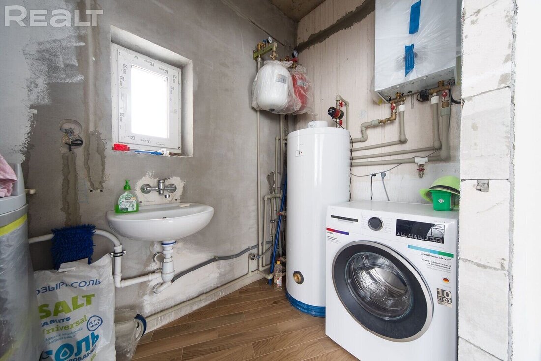 На первом этаже находится гостиная, кухня, санузел, прихожая. На втором — спальни и еще один санузел. Дом продается с мебелью и техникой.