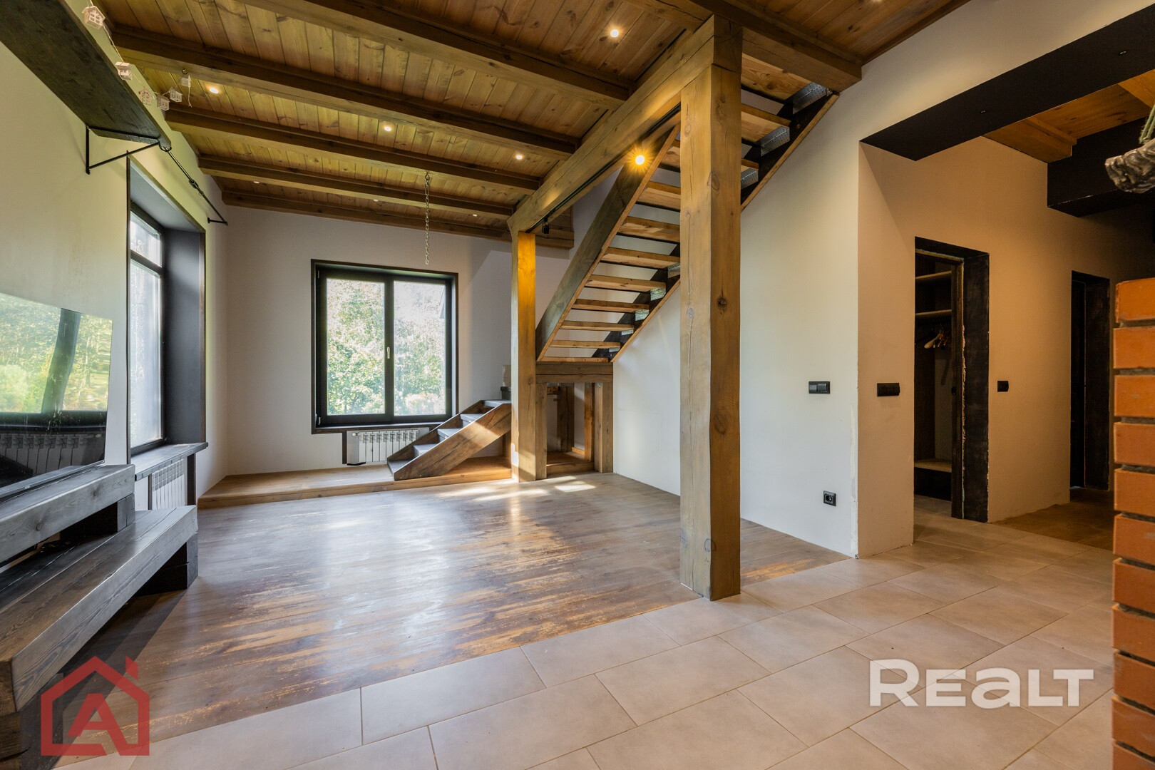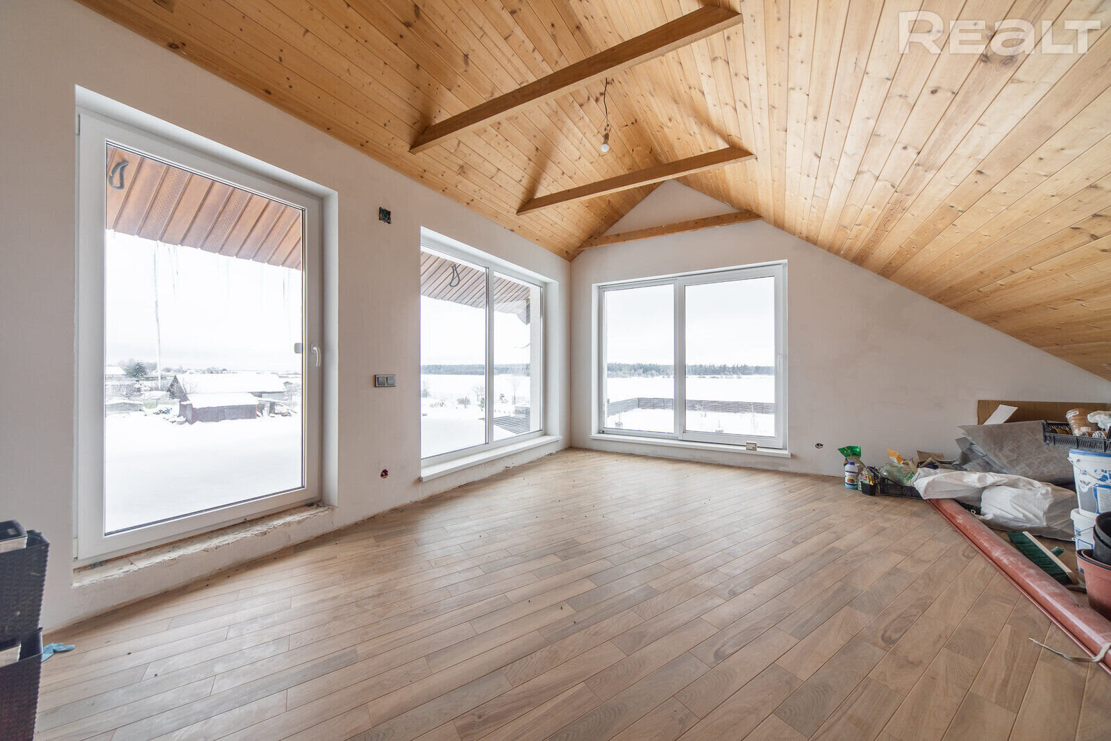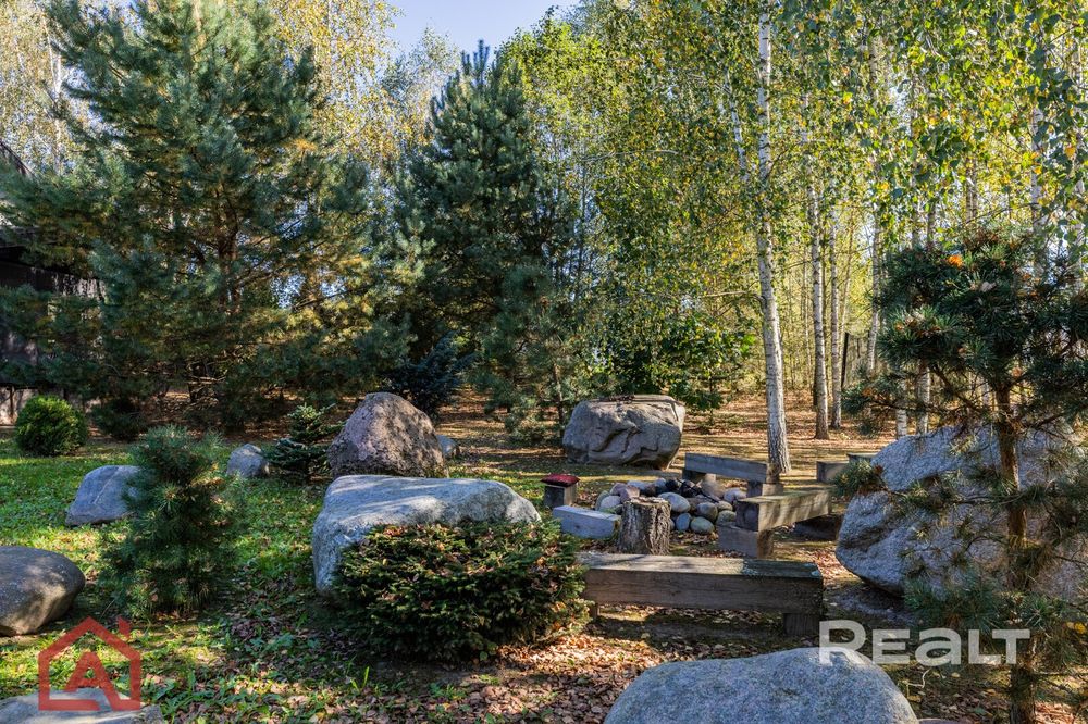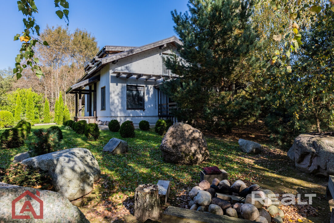Общая площадь – 126 м2. На первом этаже находятся спальня, гостиная, кухня, санузел, помещение под сауну, терраса с отличным видом на лес и сад камней. Второй этаж еще без чистовой отделки.