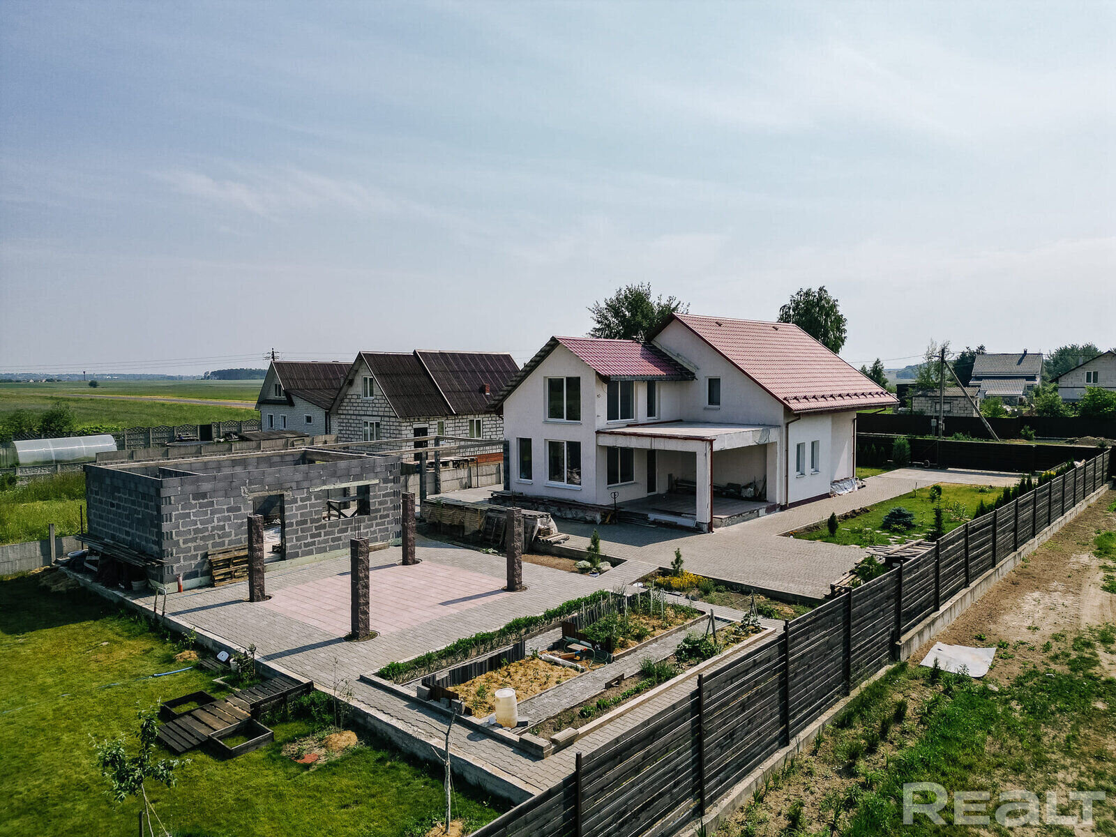 Здесь продается современный коттедж. Стены из блоков, утеплены, оштукатурены и покрашен. Построен в 2020 году.